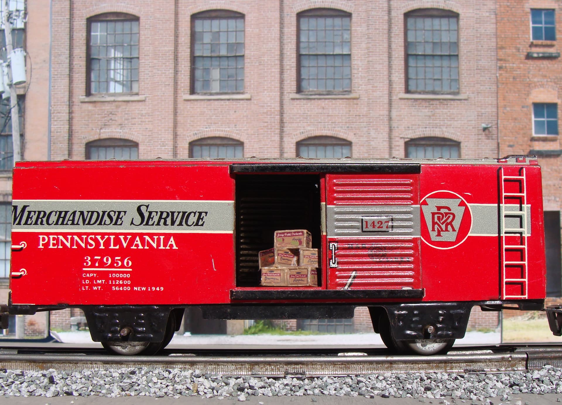 The first of two “revenue” cars in Marx’s 7-inch NKP set is a Pennsylvania Railroad boxcar with working doors. The 7-inch PRR boxcars had consecutive car numbering on the lithography masters, with the numbers running from 37950 to 37959. (Some collectors try to find a complete set of 7-inch boxcars with all 10 car numbers.)