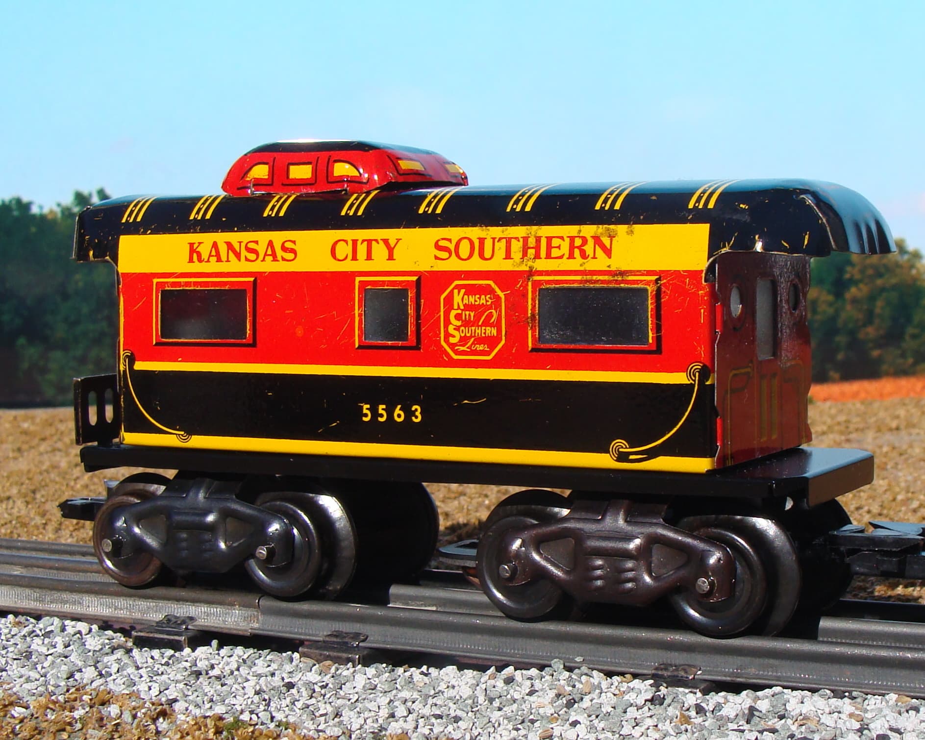 The Kansas City Southern FM diesel also had a 7-inch 4-wheel caboose (seen here remounted onto an 8-wheel frame.)