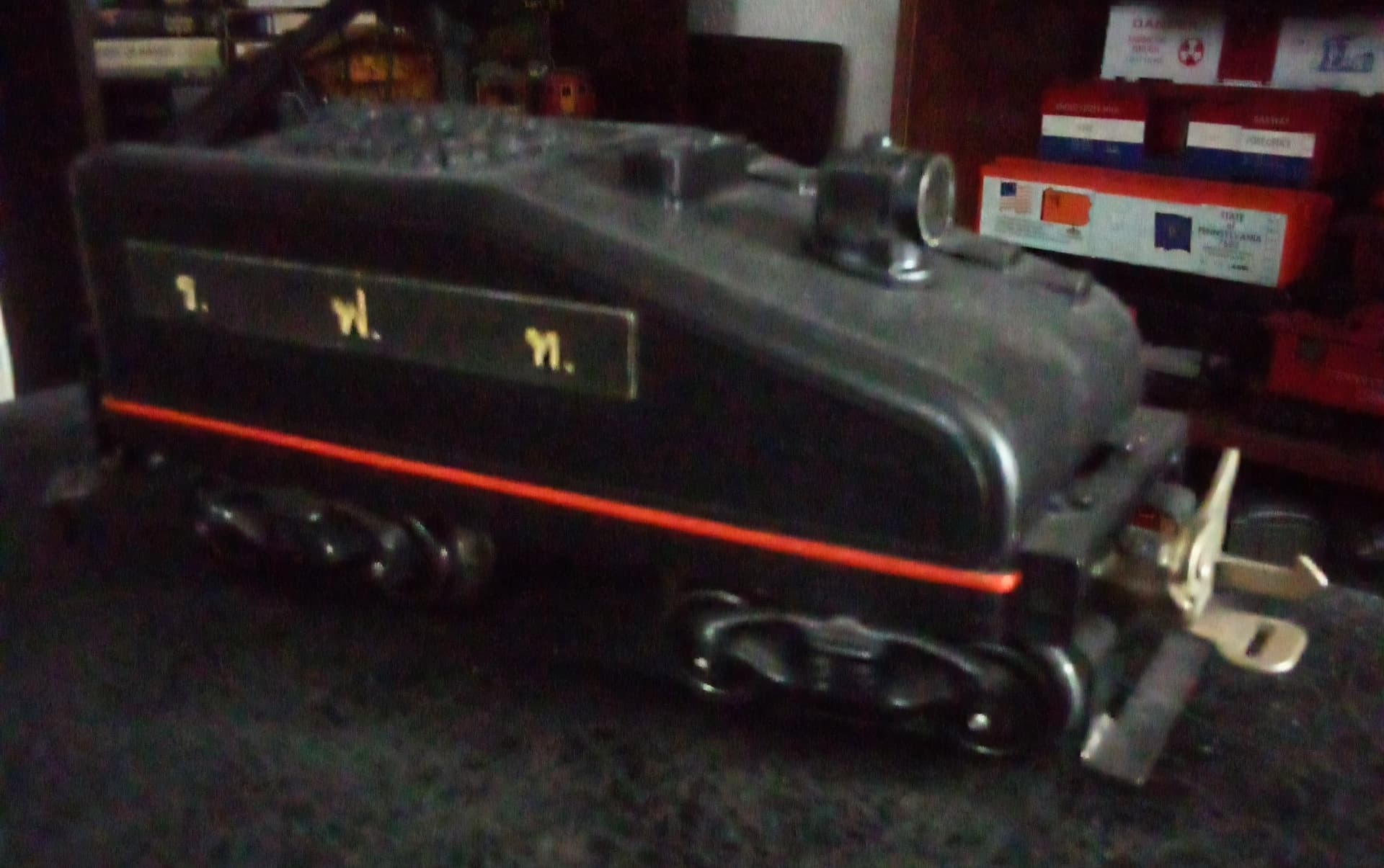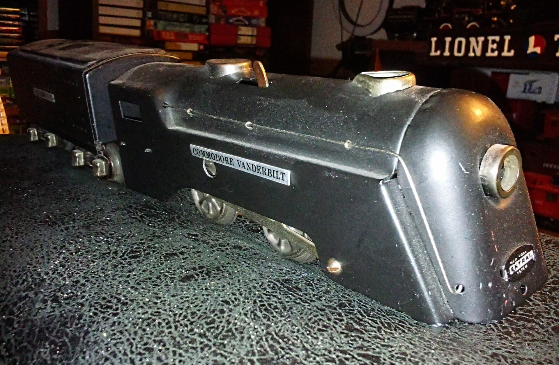 Here’s my other Marx locomotive. I repainted the clockwork CV and thought how great it would look with name plates. Especially since I planned to pair it with a Lionel tender. So I purchased adhesive backed Commodore Vanderbilt replacement plates from Olsen’s (way back when) to give it that unique touch. I run it with Lionel and Ives 1690 passenger cars.
