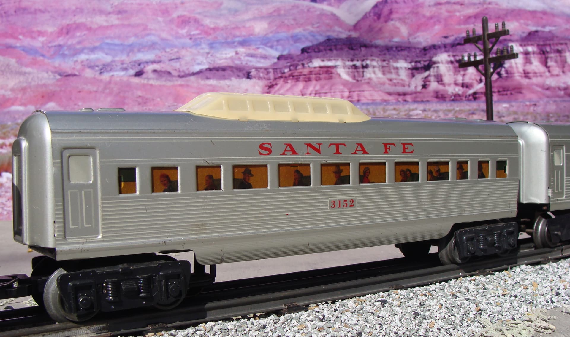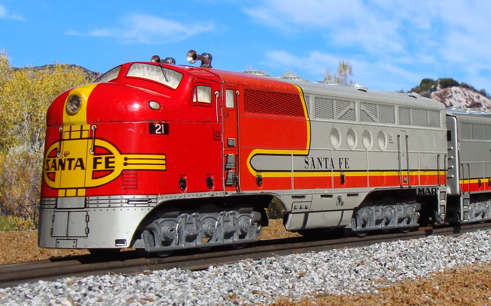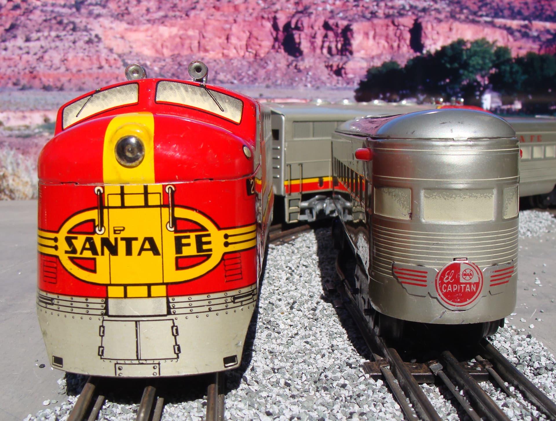 The number 21 that appears on the 21 Santa Fe FT diesel’s nose was the number of the Santa Fe Railroad’s westbound El Capitan, the all-coach Chicago-Los Angeles passenger train. To further confirm the El Capitan connection, Marx put the El Capitan name and logo on the observation car’s drumhead.