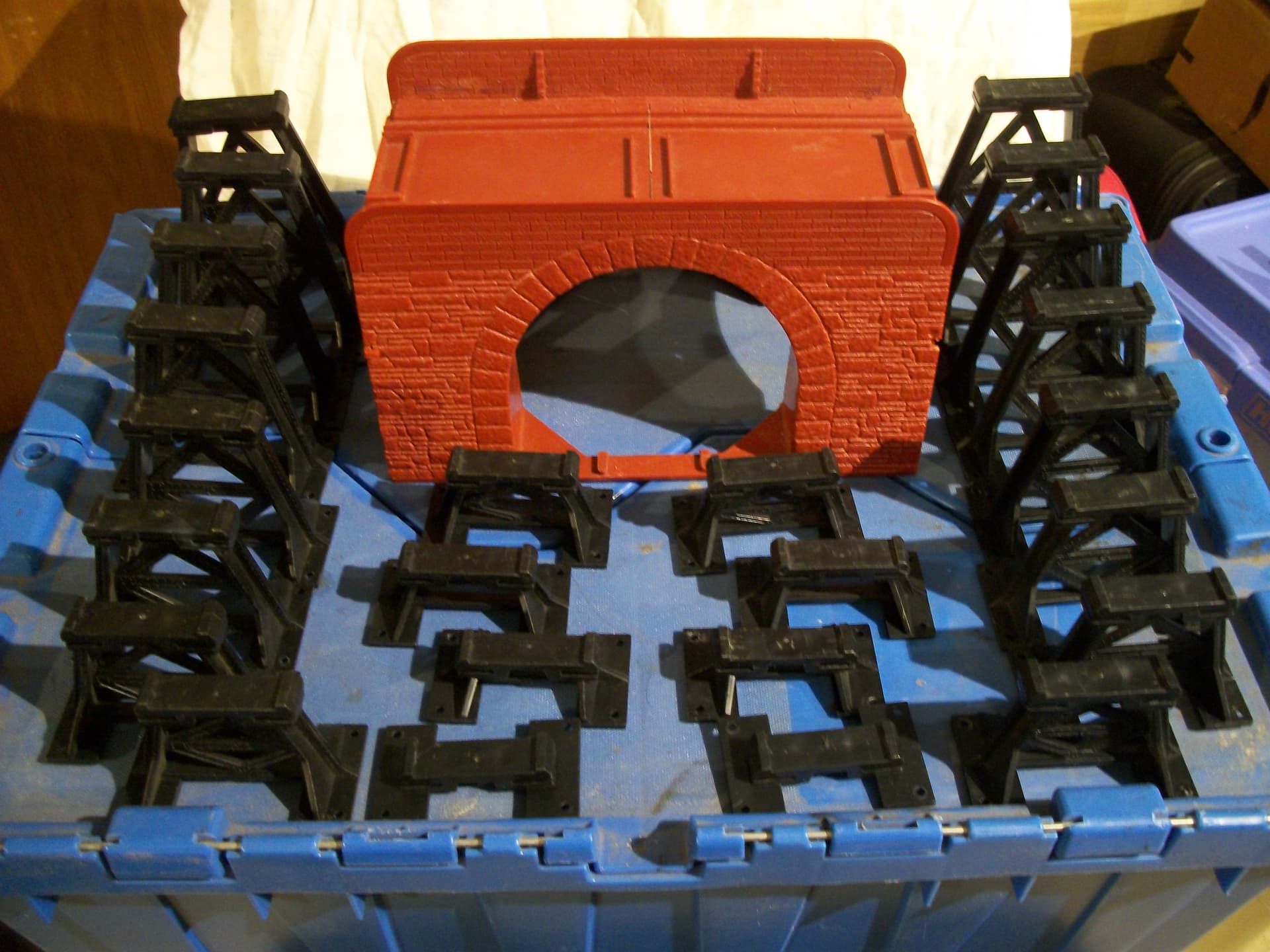 Here’s a trestle and bridge set. I think the Marx version is the best one ever made in O: I like the look of the steel trestle bents, and the stone/brick arch bridge reminds me of several I have seen locally (and it could very easily be painted and detailed by anyone so inclined).