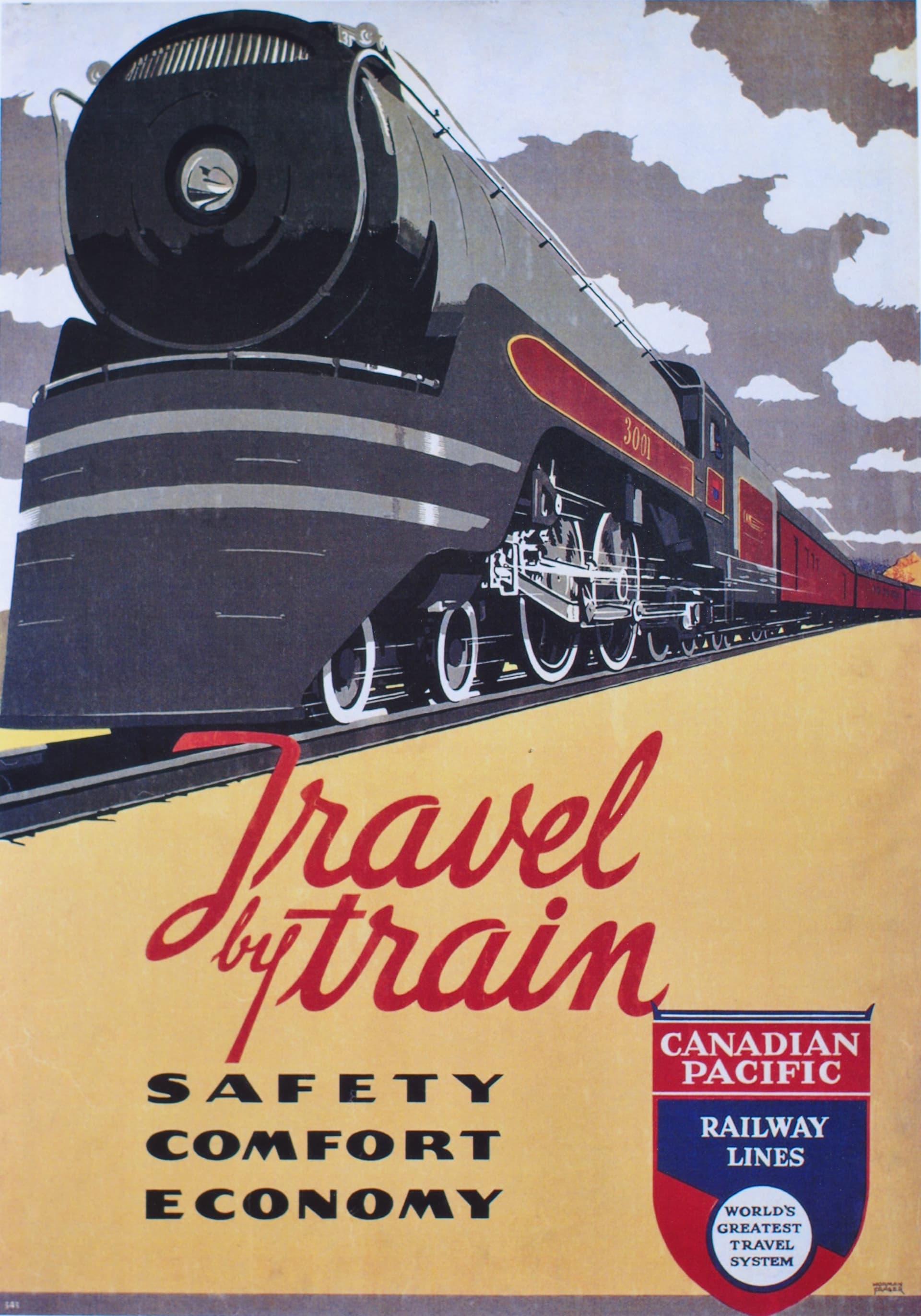 A Canadian F2a 3000-series locomotive is prominently featured on this vintage Canadian Pacific travel poster.