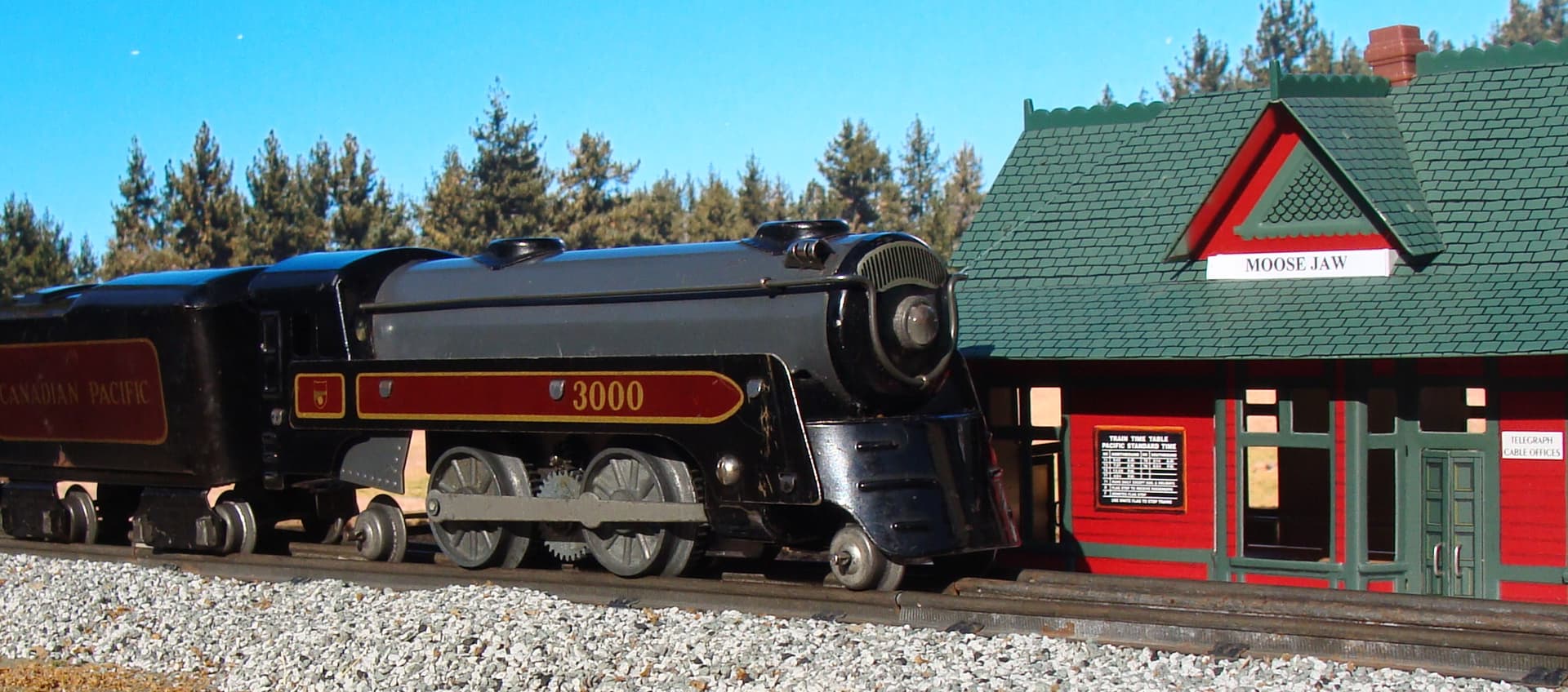 Introduced in 1937, Marx’s Canadian Pacific locomotive closely resembled the 3000-series prototype. (The three distinctive bands on the streamlined, wrap-around pilot are characteristic of these locomotives.) It has been suggested that the Canadian Pacific might have helped to finance the tooling for this locomotive.