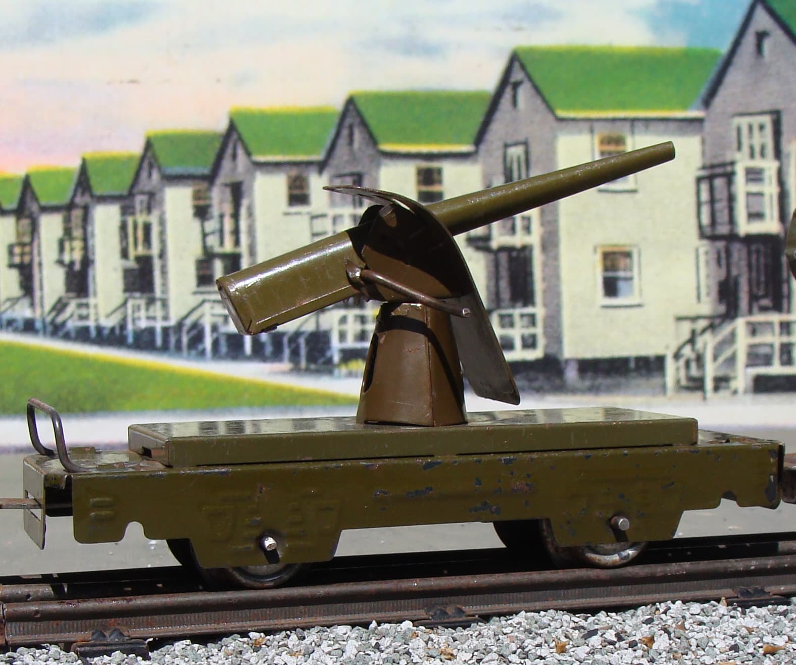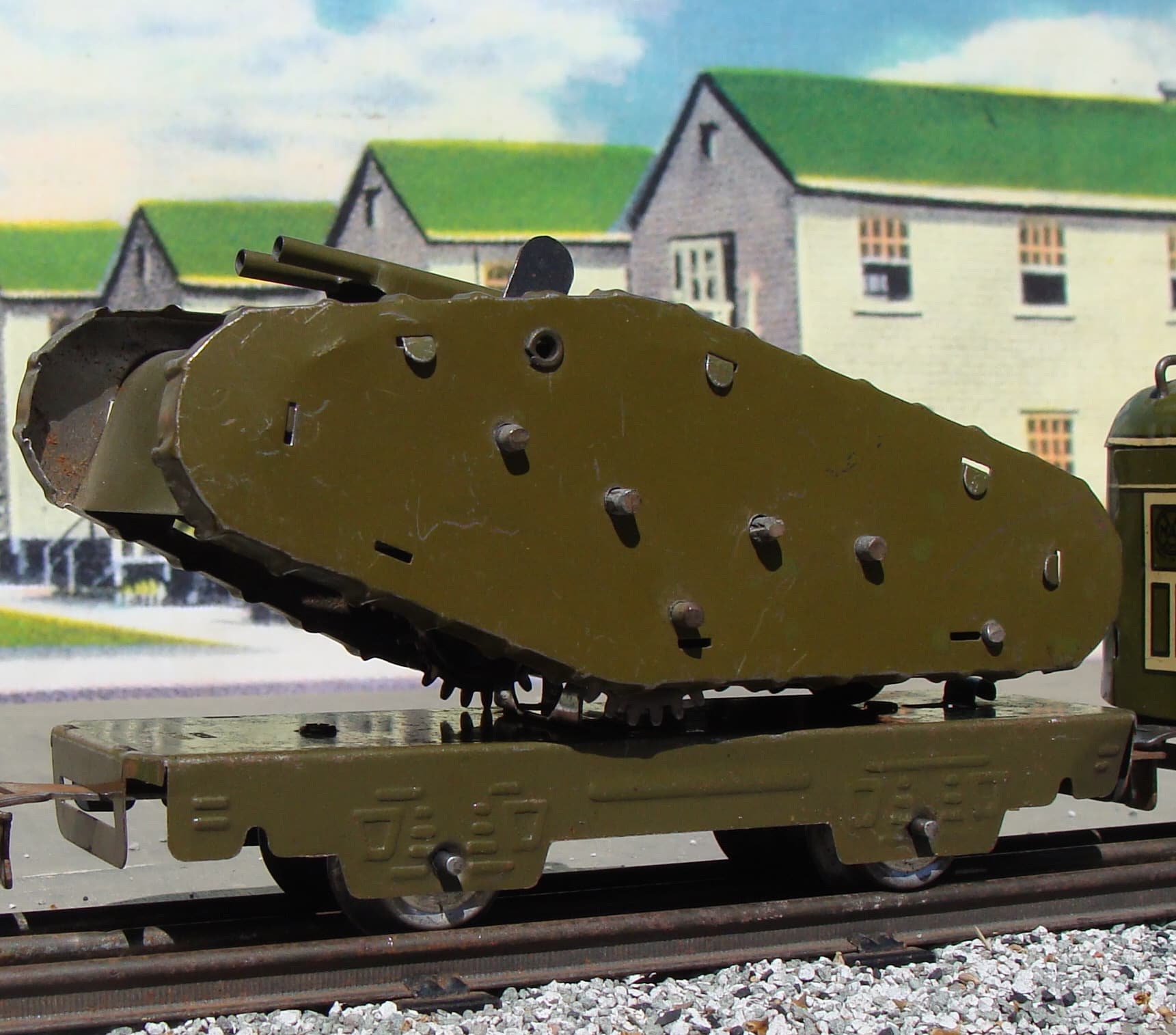 Several different tank loads were available for the Army Supply Train. Seen here is the one patterned after the British Mark II tank. Once removed from its flatcar, the tank’s clockwork motor allowed it to move under its own power.