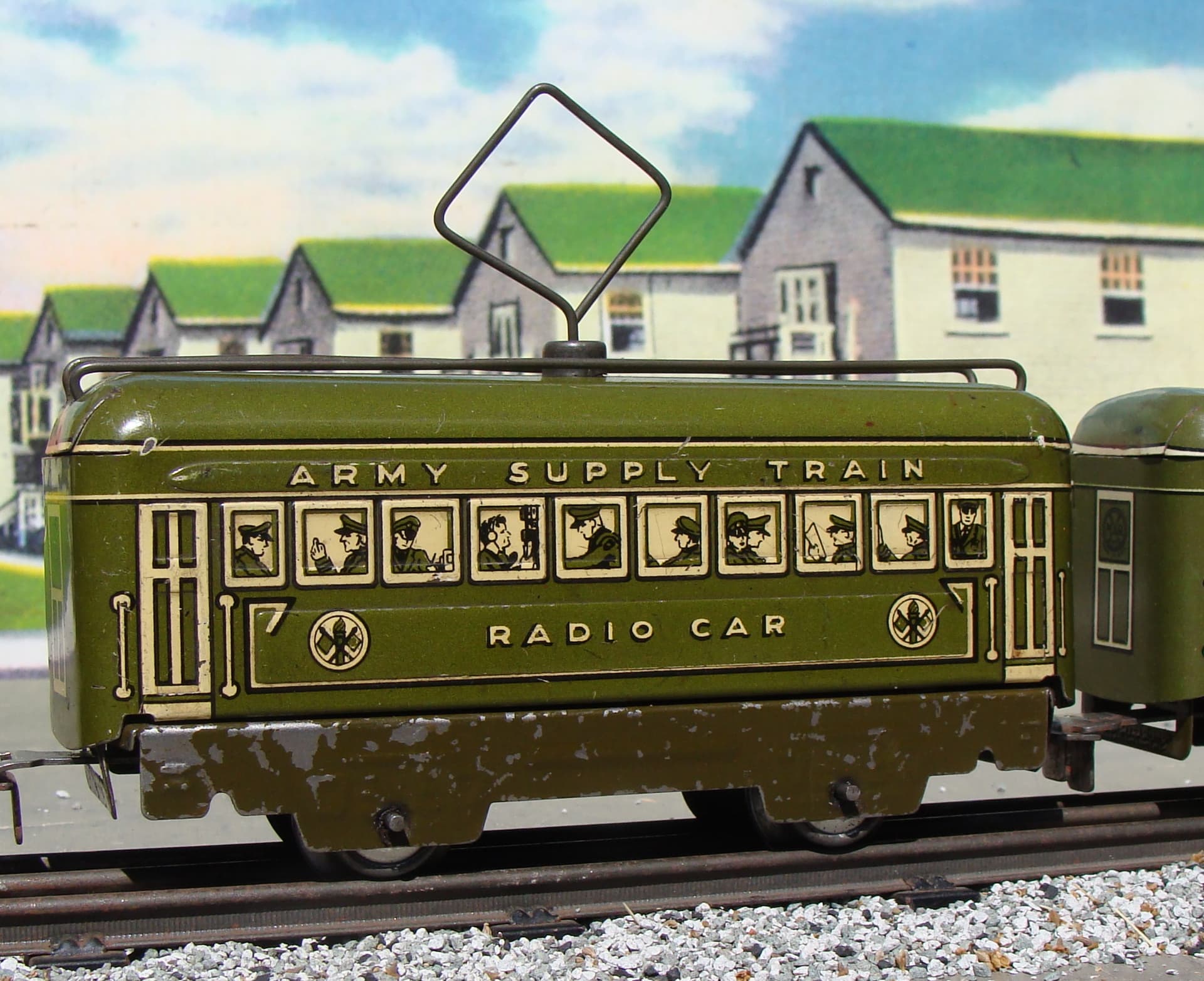 In 1939, when this U.S. Army Signal Corps Radio Car was introduced, the sending and receiving of “wireless” radio communications from a moving train involved technology that was controlled exclusively by the military. Marx’s Radio Car was available with and without the twin aerials on its roof.