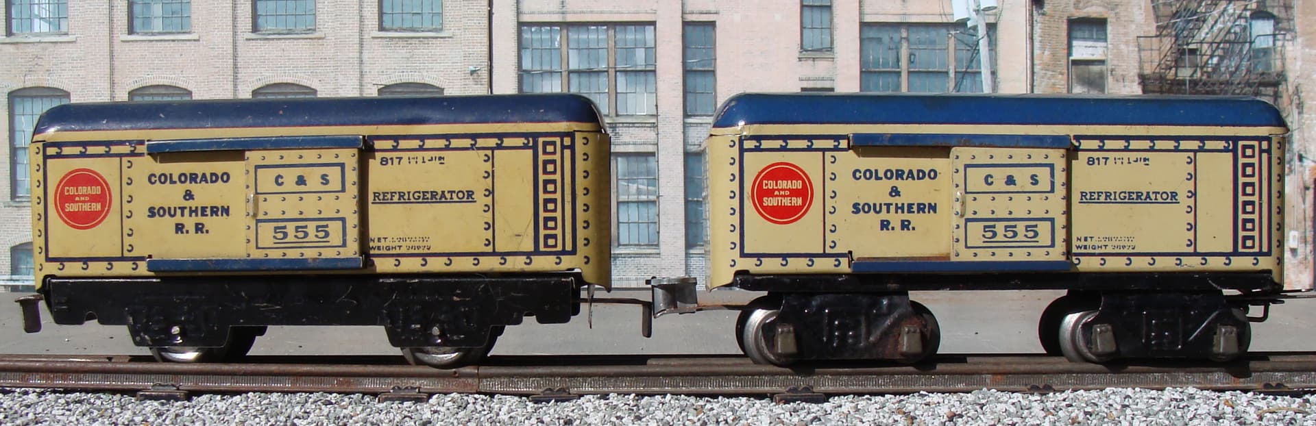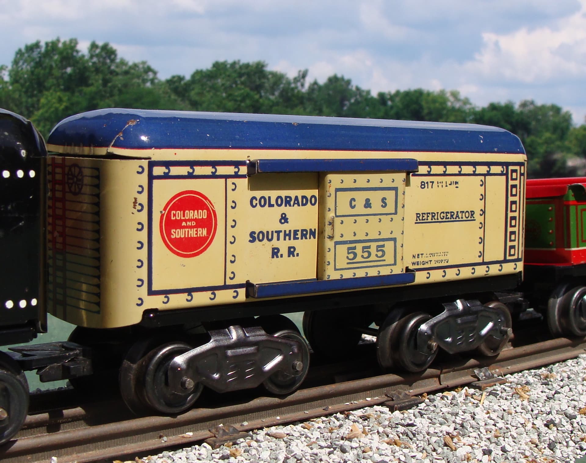 To appeal to these “scale modelers,” in 1937, Marx mounted some of its six-inch cars onto frames fitted with four-wheel “heavy service” swivel trucks. While still toy-like in appearance, these 6-inch 8-wheel cars did represent a step towards prototype realism.