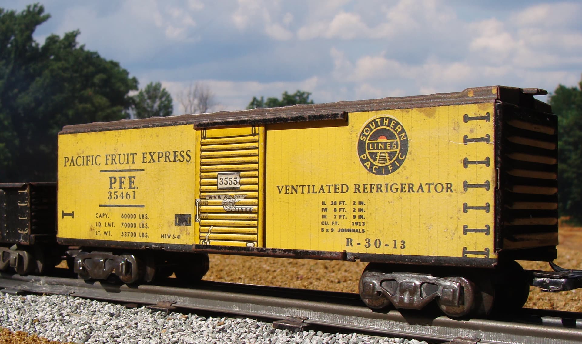 These six-inch eight-wheel cars came with two different types of couplers: tab & slot, and automatic.