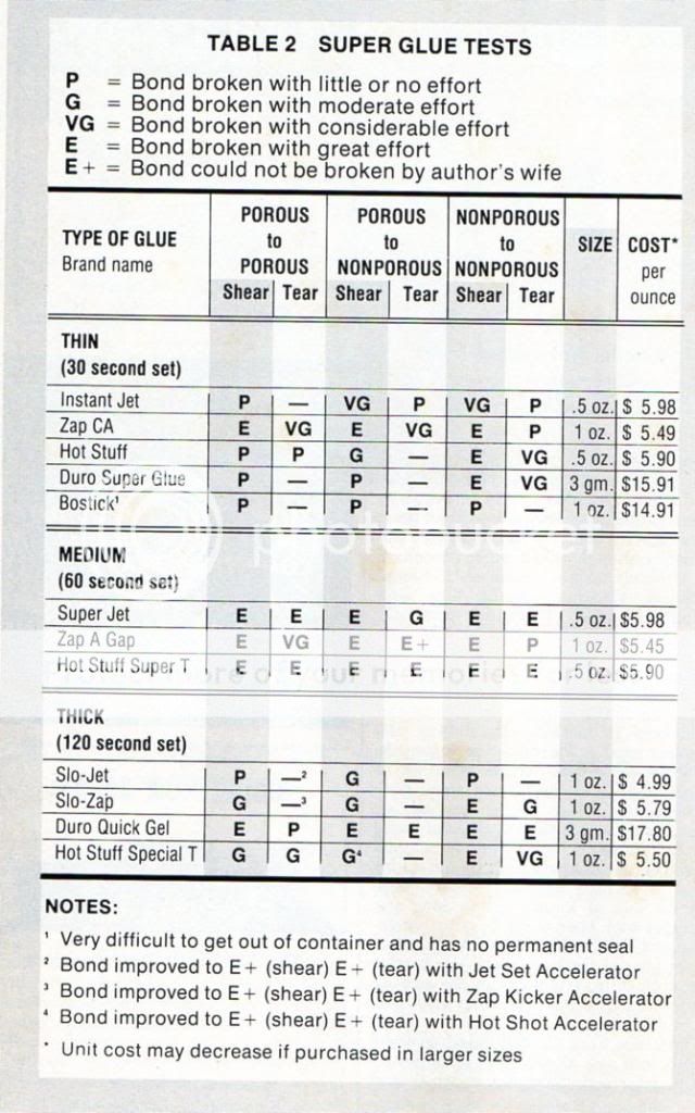 While looking through a back issue of MR (July 1988, I think), I came across an article about different types of adhesives, and it included a great chart of the different types of adhesives and their usage vis-a-vis different types of surfaces, slow vs fast setting, smooth vs porous surfaces, holding ability and some of the brand names. Has anyone seen an updated version of this chart, or one which is similar?