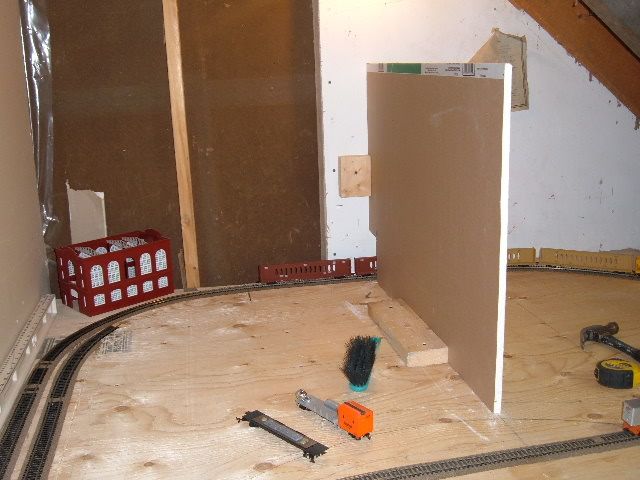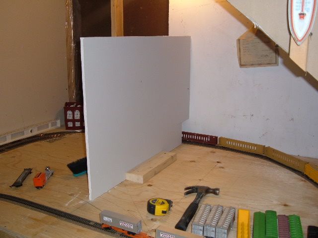 I would like to devide a part of my layout into two halfs. One side will be a gravel quarry and the other will be a coal mine. I have A piece of sheet rock installed. Is this a good enought piece of material to do this with. I also made it 24 inches high. It almost looks too hight. There are two pics below to show what I have done. I will be putting mountains on each side of it. to help hold it.