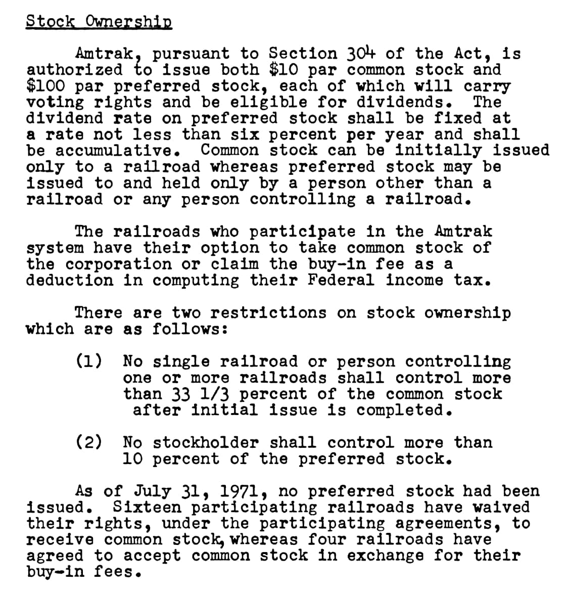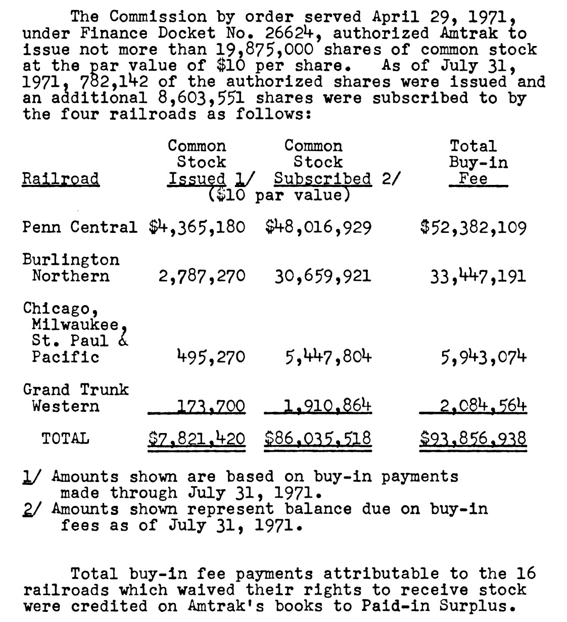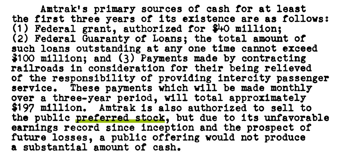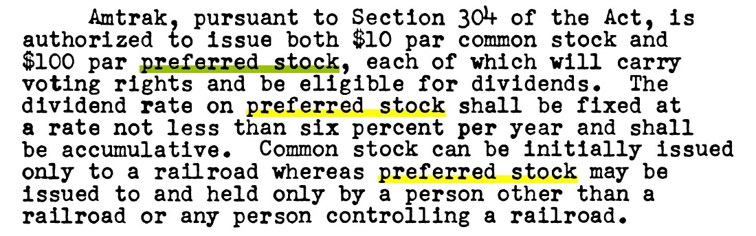 Here is Amtrak’s statement of stock ownership as of July 31, 1971, after 3 months of operation. No preferred stock at that time. Not sure when the preferred started. I’ll research more.