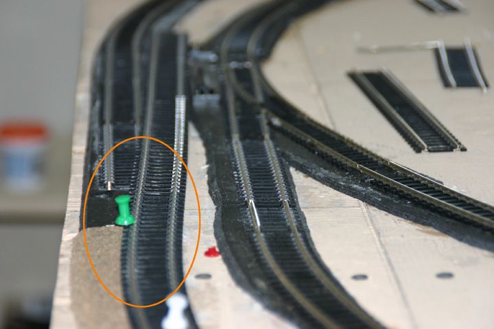 It is important to have the rail joiners attached on the end you are not cutting and in perfect alignment with the end of the track you have just previously laid to get a correct measurement. If you are gapping the joint rather than soldering cut it 1/16" short. If it is a long piece I will use quilting pins to hold the track in place while I am marking where to cut it. Then remove the pins and cut the track in the miter box. Other folks use a Dremel with a metal cutting disk witch I assume works just as well.