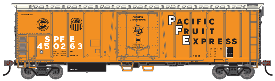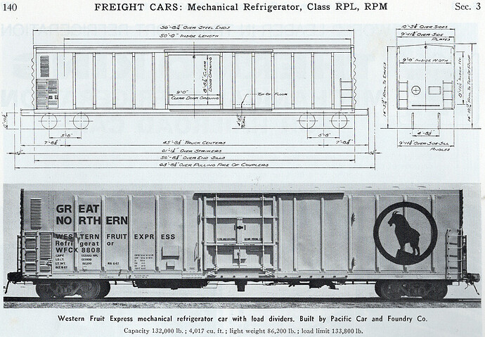 Unfortunately I am not familiar with PFE cars. My model, WFCX 8813 was within series WFCX 8800 to 8979, built by PC&F in 1967. Cars in this series had an interior lencth of 50’, an exterior lenght of 63’ 9"… (page 38 of Great Northern Equipment, Color Pictorial - Book Three by Scott R. Thompson 2000) According to this book, the first Western Fruit Express refrigerator cars with exterior-post construction were the WFCX 8200-8299 in 1963.