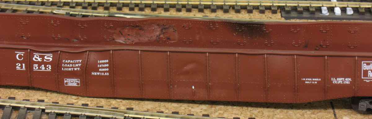 One of the best battered gondola models I have ever seen, in any scale, is featured in Keith Kohlmann’s excellent article “CNW’s Used G31 Gondolas” in the Jan/Feb 2008 issue of N Scale Railroading. If I read Keith correctly he uses thick ACC between the ribs to mimic the outward bulges that old gons get. Even if you don’t model in N I recommend getting that issue.
