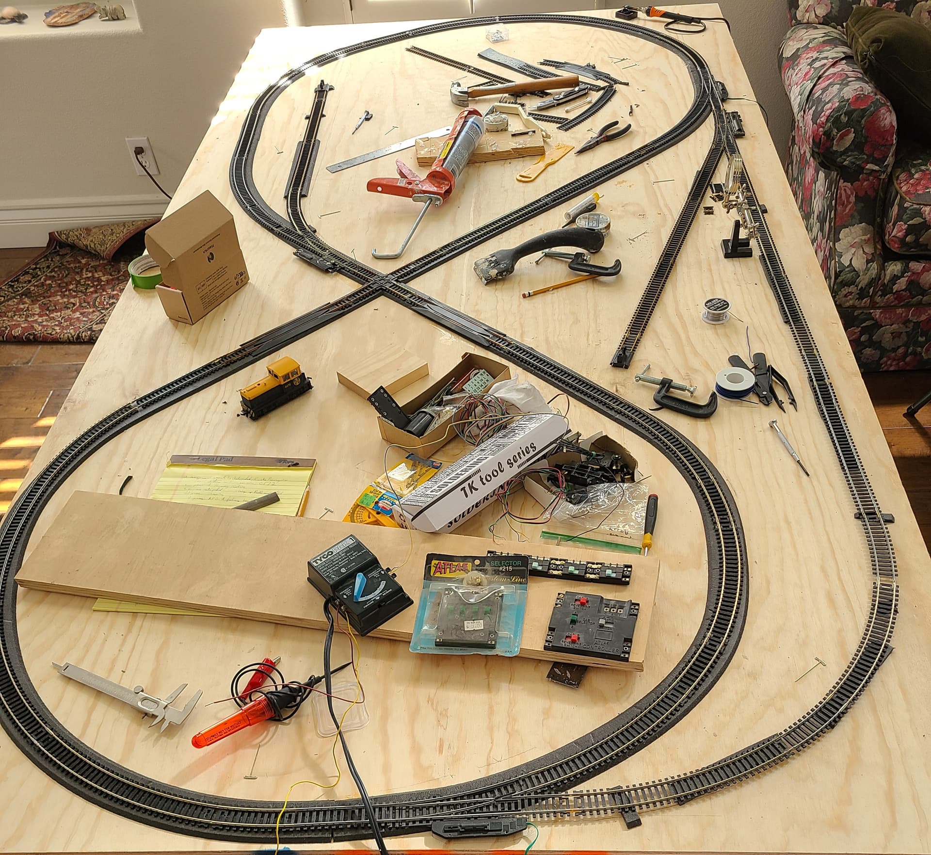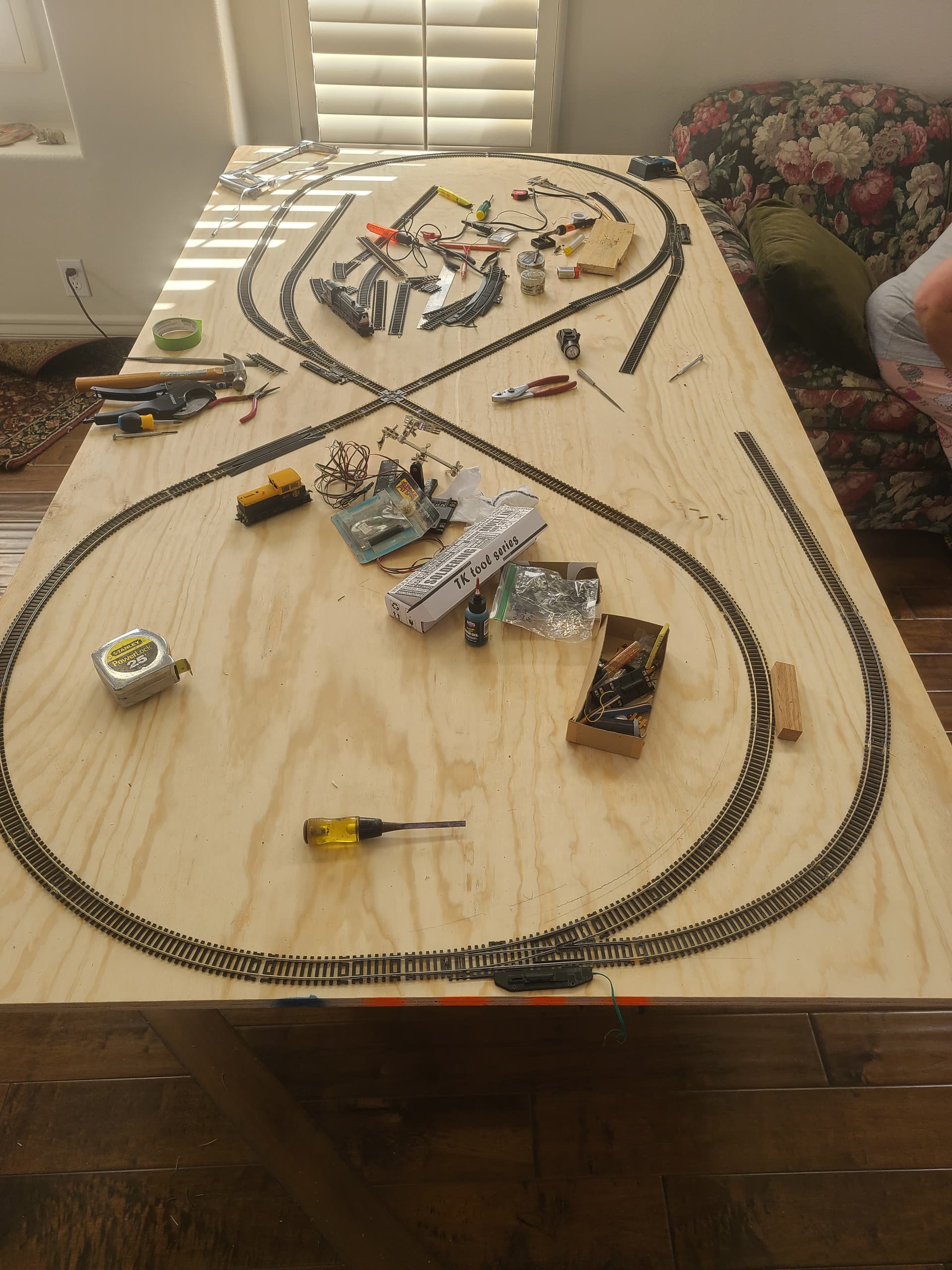 My plan is to trace the layout onto the 4x8 plywood, then remove the track and glue wood scenes track bed down with silicone caulking. Af