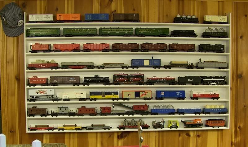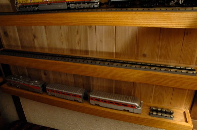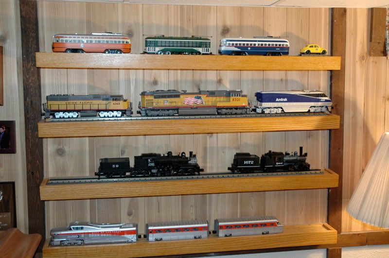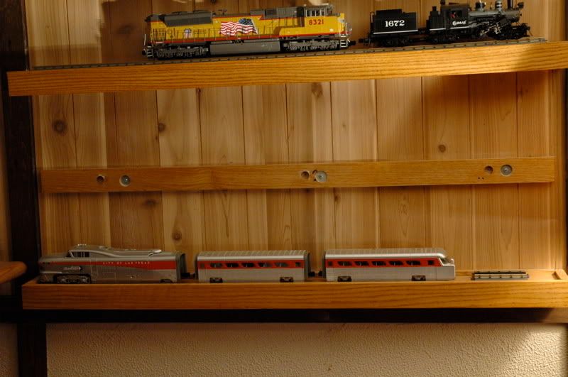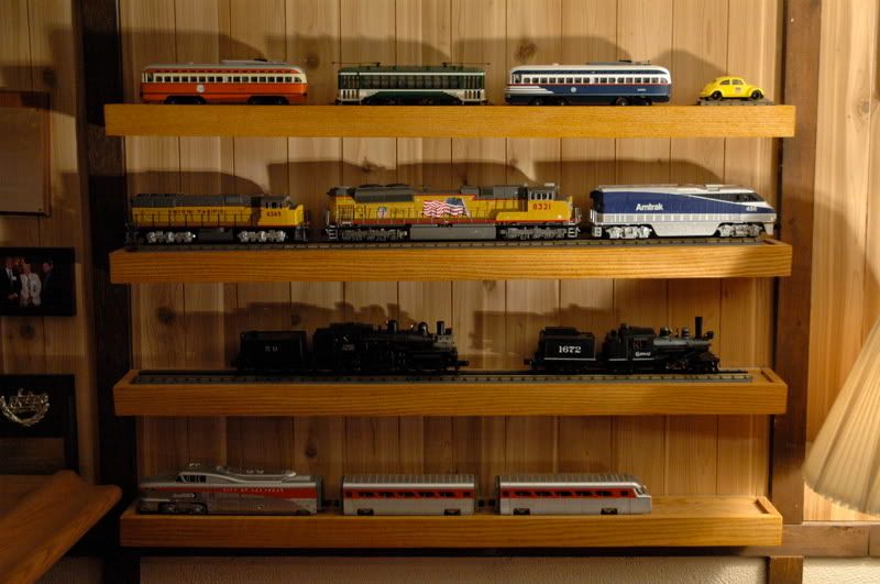 Yeah, thanks for the ideas. I like the idea of having LED lights and mirrors in the back. That would be a nice touch. Cutting groves for the wheels is a good idea, so they dont go rolling off the shelves. I have all the tools to do it, just need the extra $$$. Oak is not cheap. But, oak is strong and matches my decor. I also, like the idea of the metal railings on the wall, so you can adjust the heights and locations of the shelves. With the oak as the shelves, i think it will look good. I have seen other people with this setup. I hope those shelves will support my big standard steam locomotives. Thanks.