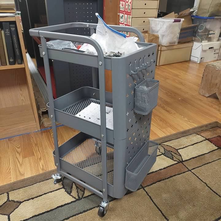 I have some mobility issues, so I frequently find myself stabilizing myself with a wall or a piece of furniture or a countertop. I also use a walker or a walking stick. In planning the Arrowhead Central I made sure that I I had space around the layout for a walker (and inevitably someday probably a wheel chair). As I work around the layout I am aways laying a tool or some piece of equipment somewhere. It can be frustrating to make all the extra moves to get what I want. So I did some shopping online and found a small utility cart that I can move around with me from place to place. I have trained myself to put tools etc on the cart. Its a great help.