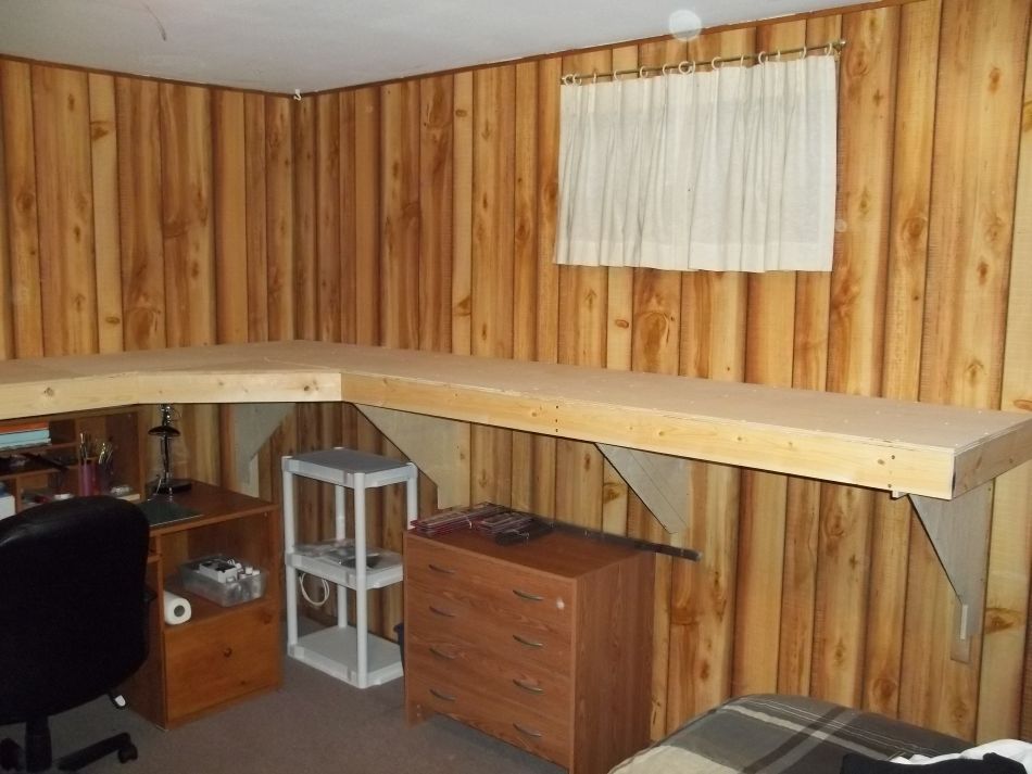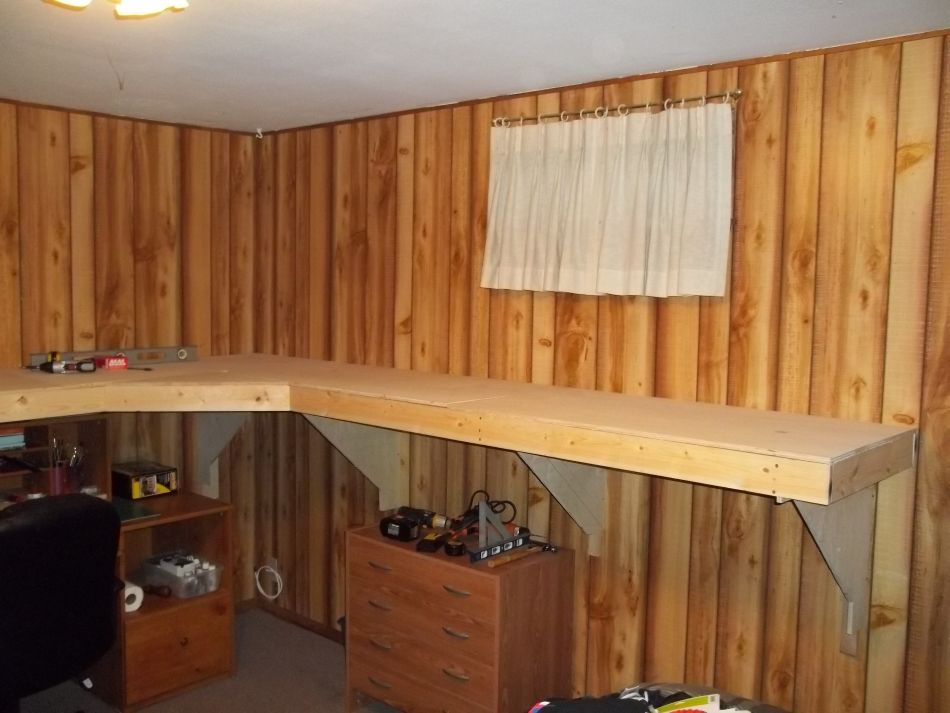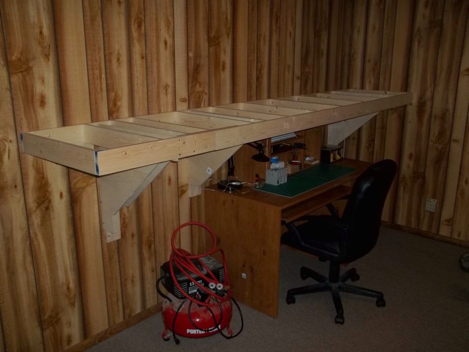 OK the first of the bench work was installed last night. This is a 2 foot by 10 foot sections. Ground Zero with the foam and plywood will be right at 51 inches. I have another 10 foot section to get installed today and to screw down the top as well. I modified an old computer desk and made it into my modeling desk. I put furniture sliders on it and it just slides right underneath with room to spare. It’s 2 foot deep as well so eventually when the layout is skirted with masonite and fabric it will not even be noticed.