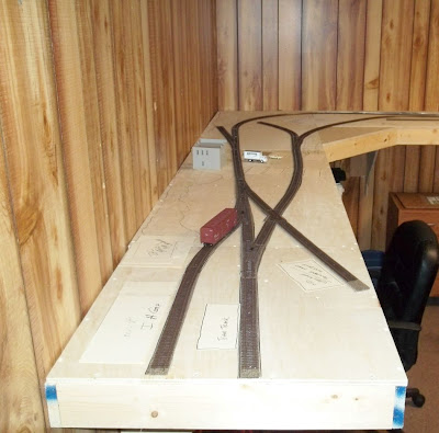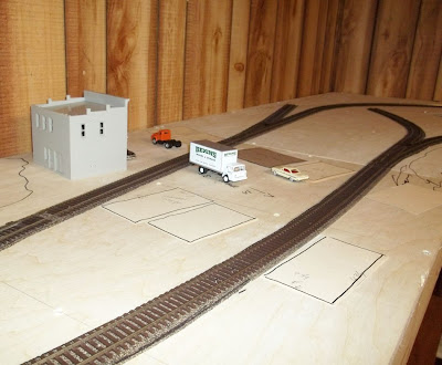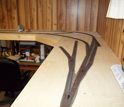 Well this weekend I big plans on laying the cork and getting the wiring done and working on a locomotive but as it turns out, I am slow! I got the cork done and that was about it. Wiring is next. Here are a few pics with the cork in place. I used N scale 3 x 30 pieces to keep it on a low profile.