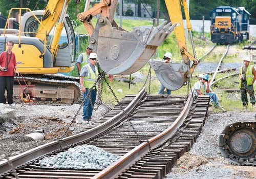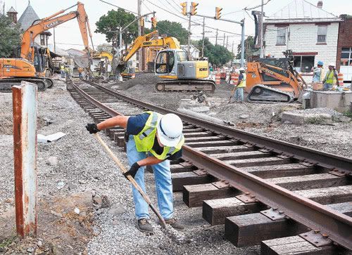 Replacing the rails TOP: Part of Kent Street in Winchester is closed to through traffic this week as CSX replaces old rails. CSX workers align a section of railroad track with heavy equipment at Kent and Piccadilly streets Monday. The project should be finished by Thursday. CENTER: CSX signal department employee Rick Long of Hedgesville, W.Va., shovels gravel from beneath a new 120-foot section of railroad track. BELOW: CSX employee Shane Pentoney of Berkeley