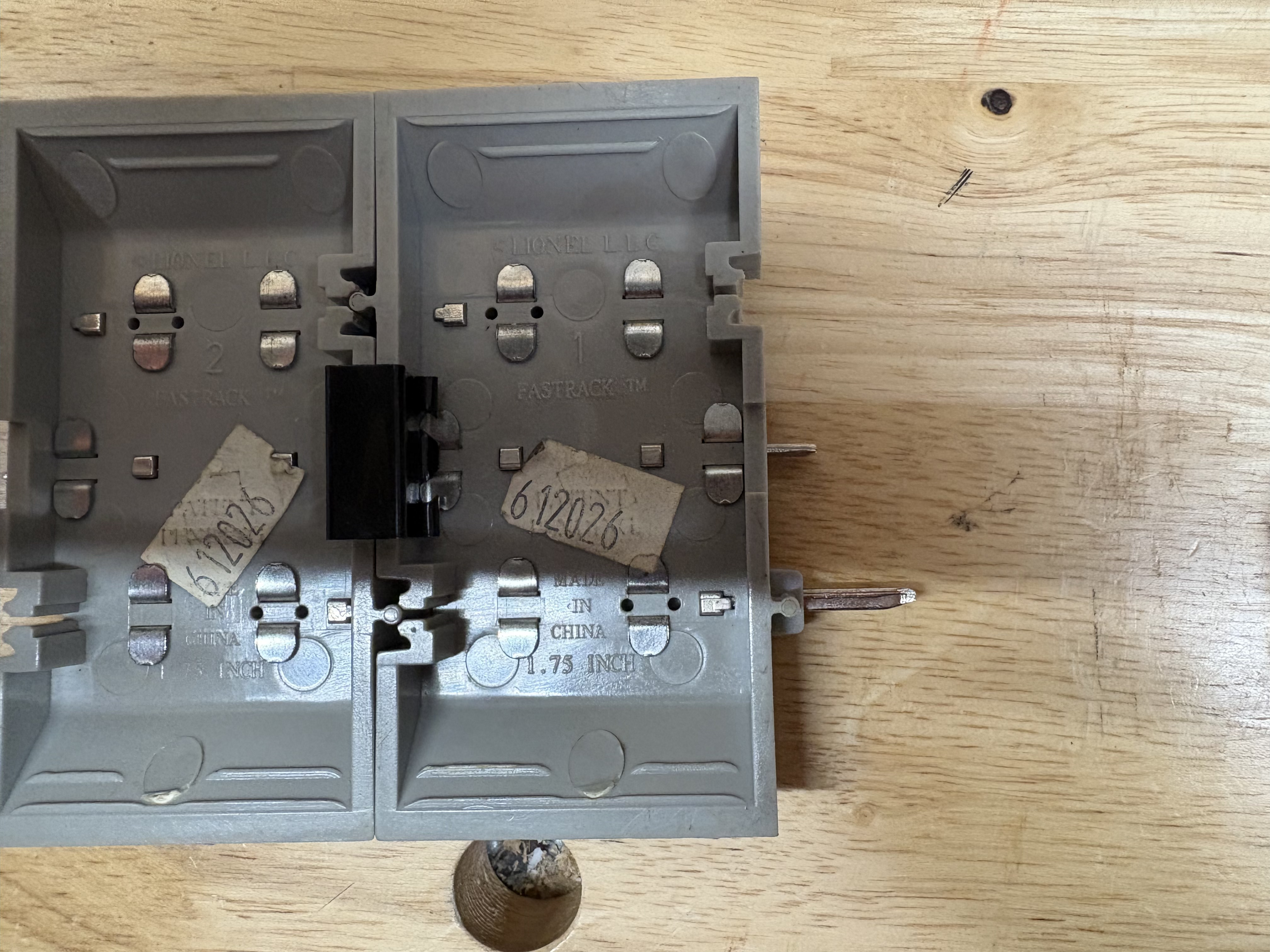 I have changed my Fastrack layout so many times over the years a lot of the tabs have broken. I use binder clips to hold the track together. I do not fasten the track down. It sits on top of indoor/outdoor carpet.