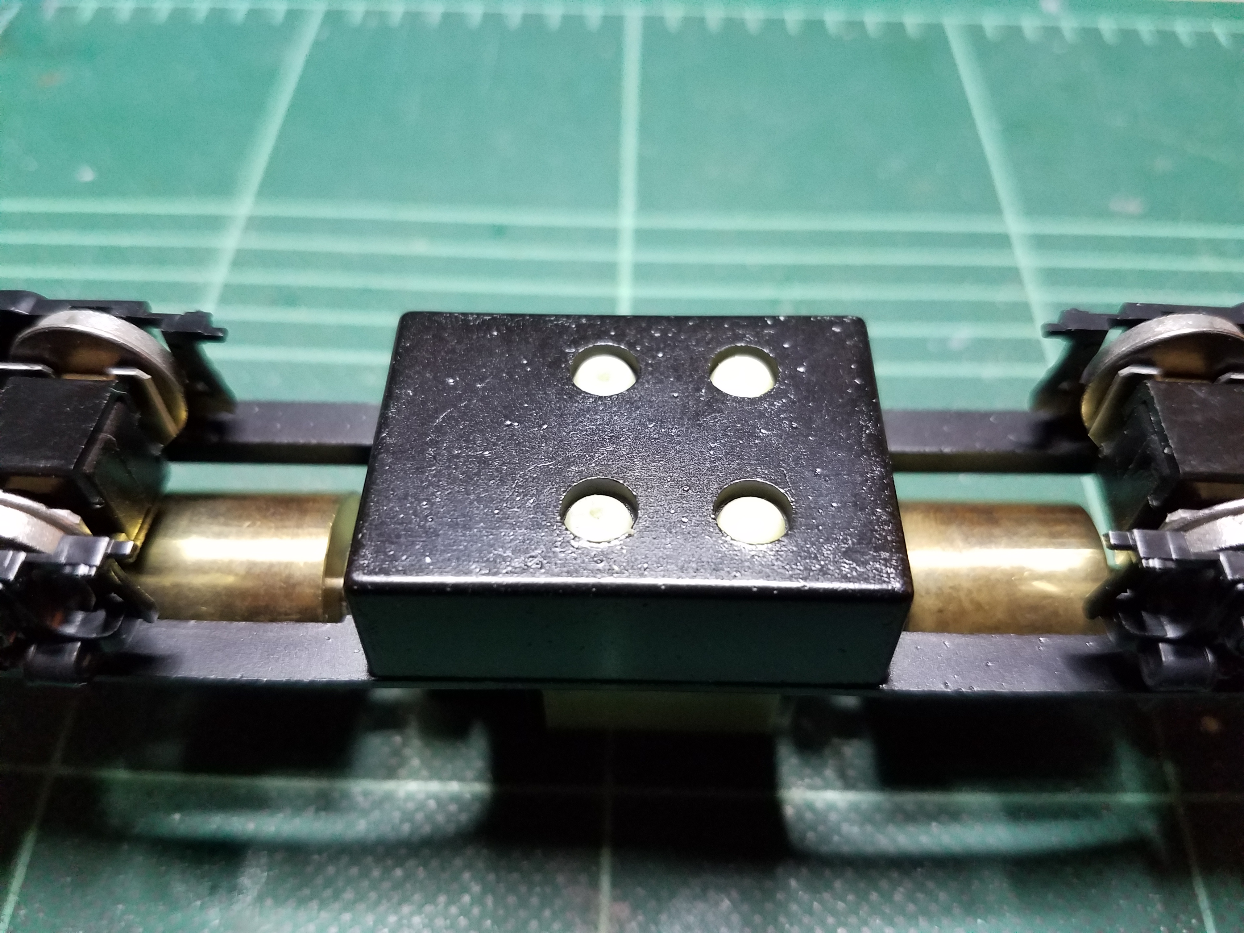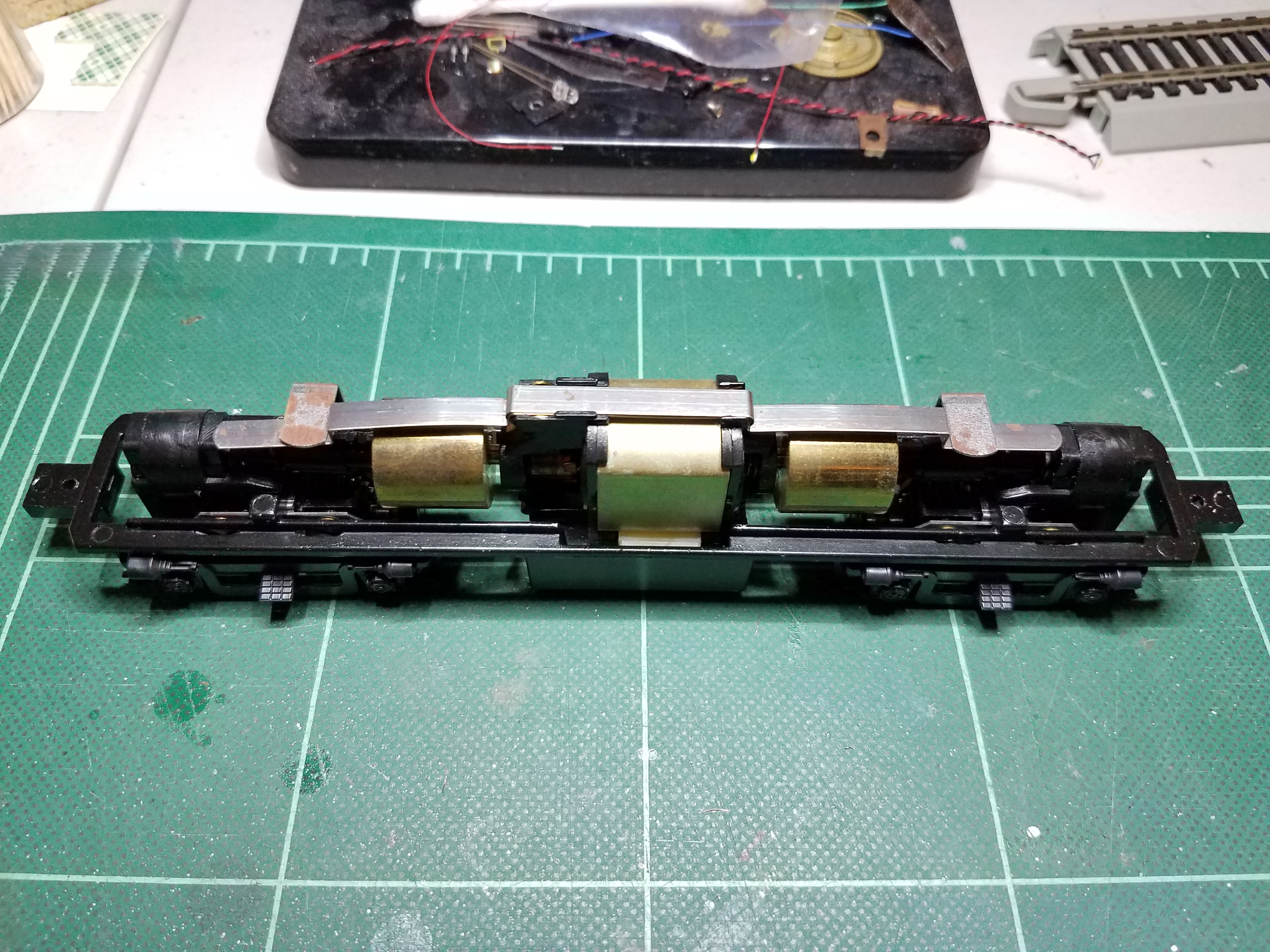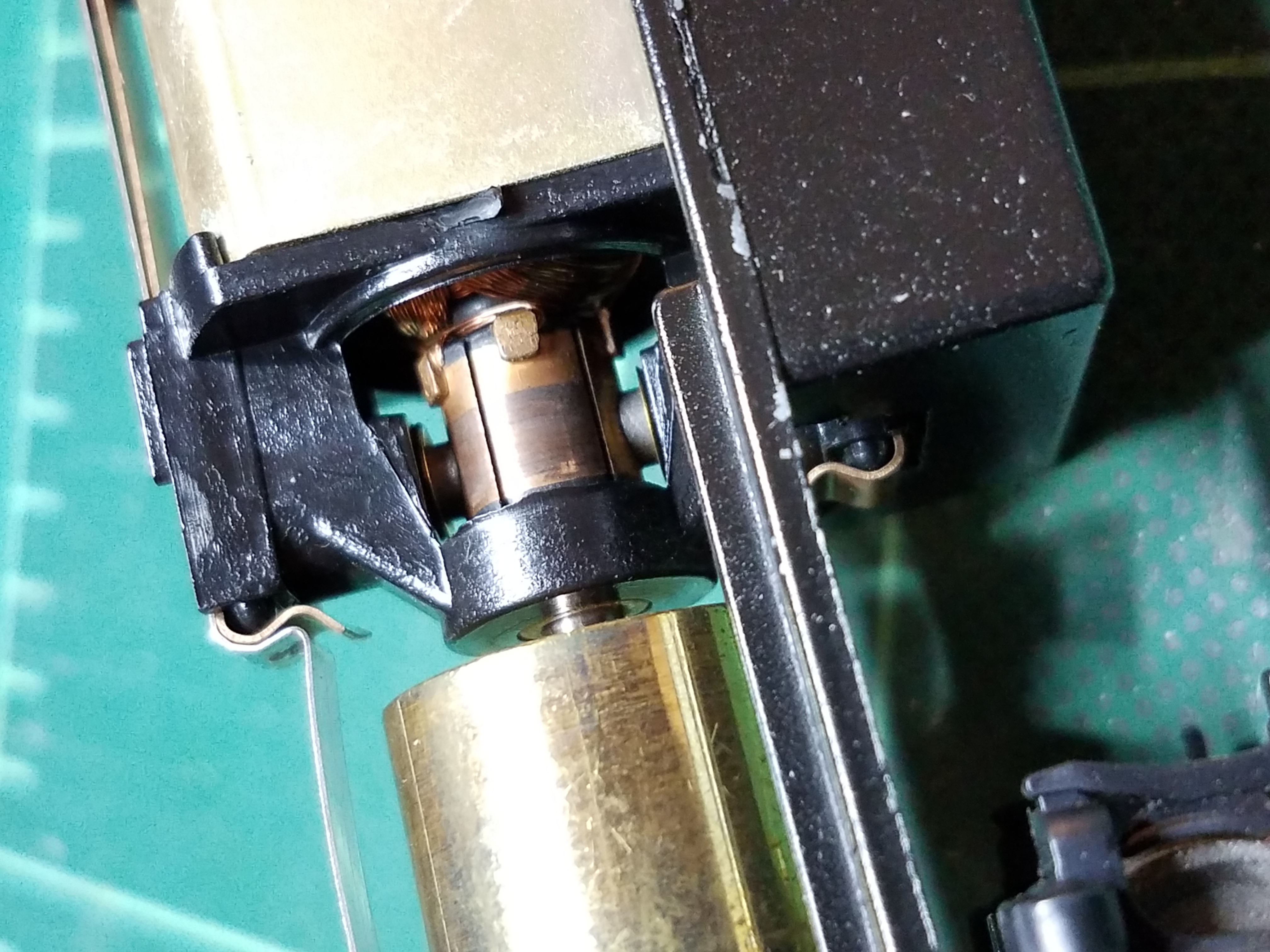 I received the Stewart AS-16 a couple of days ago. It apparently is a very early version of the model, as there is no 8-pin socket. There is, however, a “stepped” metal clip on top of the motor that makes the connection between the positive brush of the motor and the right wheels of both trucks. The left wheels complete the circuit via the chassis: