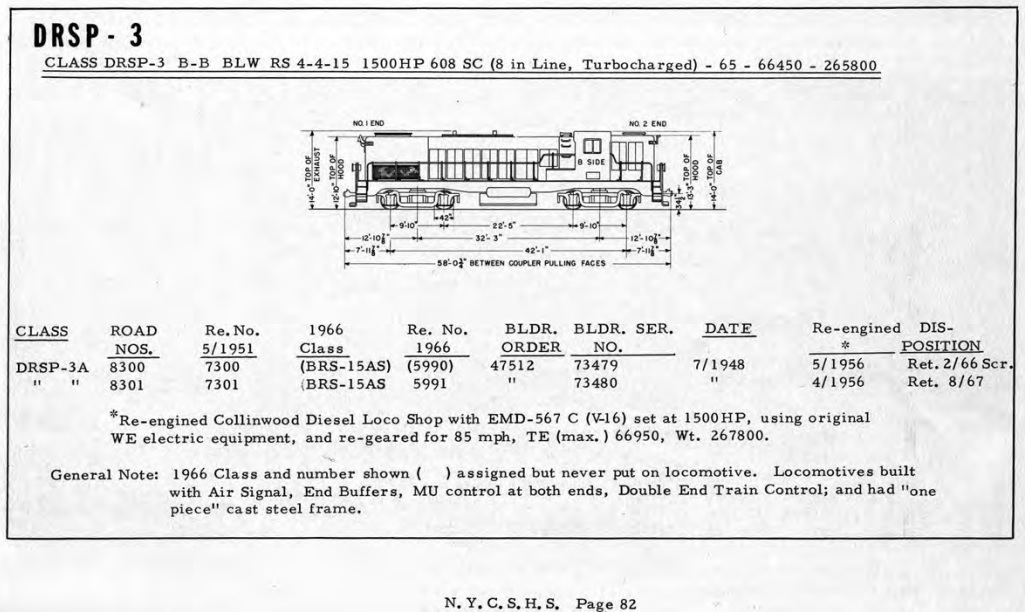 Thanks for the info! [:D] My copy of Later Power is buried in a box. However, I have a .pdf copy of the NYCSHS’s “Central Headlight - Diesel Roster Issue 5 - '77” issue that lists some of those dates/numbers differently. Pg. 82 states that the two DRS 4-4-1500s started out with road numbers 8300 & 8301 in Jul '48, were re-numbered 7300 & 7301 in May '51, and re-numbered again 5900 & 5901 in '66 before being retired in Feb '66 & Aug '67, respectively. And it lists them as being re-powered in Apr & May of '56 with EMD 567C V-16 engines, as you mentioned.