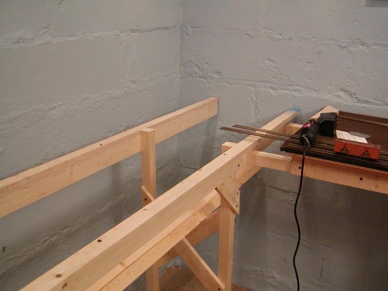 I clamp one into my bench vise narrow side up. Using small clamps, lay the other board along the edge of the one in the vise, lining up the edges. Drill small pilot holes through the top strip into the other one. This will prevent the strips from splitting when you put screws in them. Remove the top strip, then apply a bead of white or yellow carpenter’s glue. Reclamp the strips and screw some #6 or #8 drywall screws. Attach the legs to your L-girder. You can run diagonal braces from the legs to points on the L-girder, or to each other. I had some serious wobble in my legs until I used this method. I saw this construction method on one of the DREAM-PLAN-BUILD DVD series available from Model Railroader.