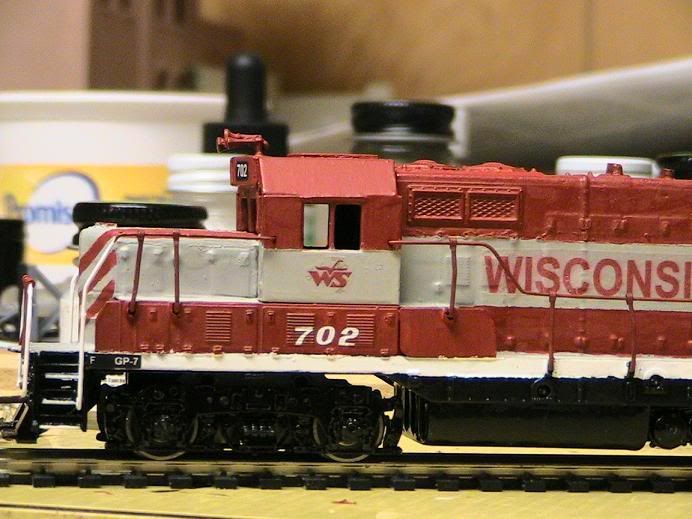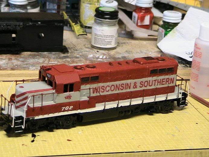 Wow, this was a long project- almost a month and a half. I started with a high-nose GP7 shell and lowered the nose and added a modern cab. I then painted it and struggled for a few weeks to get my custom decals to print off right. I modeled the Wisconsin and Southern’s GP-7 #702. Prototype pictures can be found here: http://s184.photobucket.com/albums/x218/MFJ_album/WSOR%20engines/WSOR%20702/ . Extra special thanks to a forum member here, WSOR 3801: I could not have done this without your help! [:D] So without further ado, my kitbash: