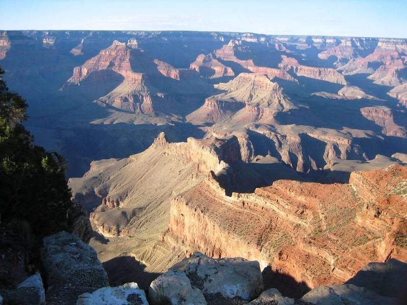 One note I will add is this: If you plan to hike into the canyon at all, be sure to bring plenty of water. My cousins and I backpacked to the bottom on the South Kaibab Trail and hiked back up the Bright Angel Trail. Due to the difference in altitude, there was a 20ºF difference between the rim and Phantom Ranch at the bottom. It was around 80ºF on the rim, and it was 99ºF in the shade at the bottom. I drank 3+ gallons of water on the way back up! (BTW, if you’re there on a hot day and do hike to the bottom, be sure to come up Bright Angel instead of South Kaibab. The former has water available while the latter does not.).