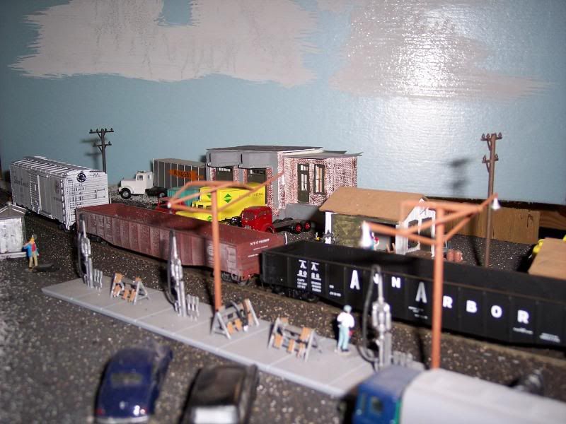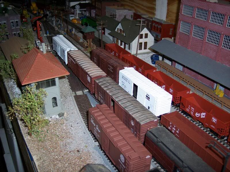 This is an early photograph, some of the hoppers are new, some of the box cars have black chalk, simple toy brand; dusted on the roofs and lighter pastels from Walmart and Hobby Lobby on the sides. I admit light weathering is what I like, but over the years I have used different chalks, powders, tempra paint powder, India Ink, and sometimes dirt all can create weathering.