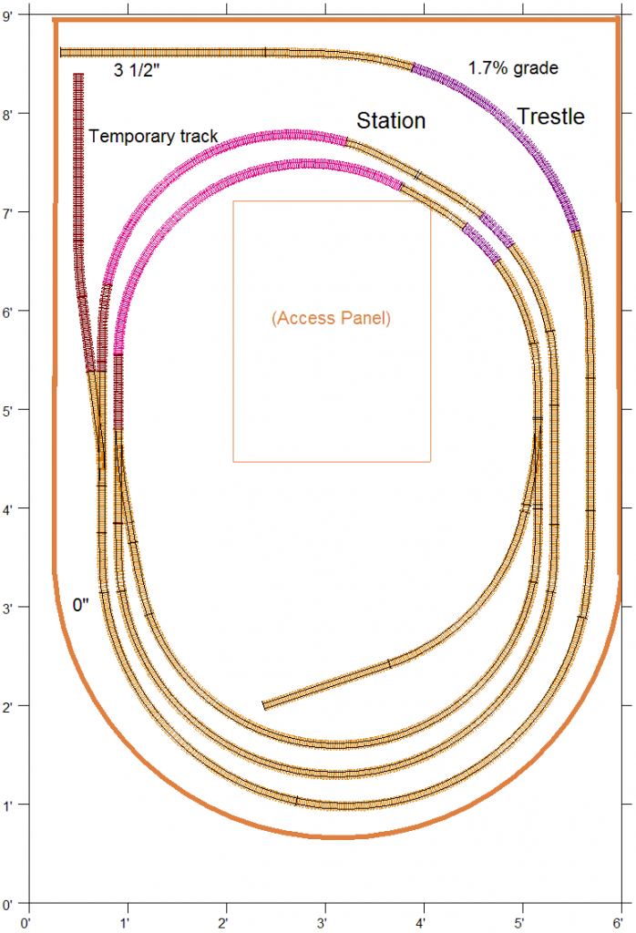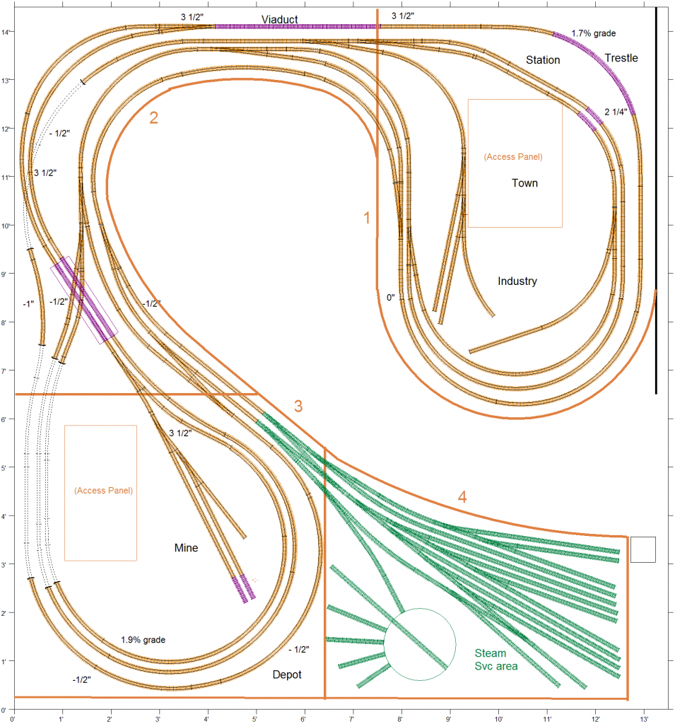 Enough to get my feet wet, prove I can lay track and turnouts that are trouble-free, dip into DCC, wiring and controls, and work on my skills at scene building. But I am on a 5+ year plan. Here is the latest revision to my completed layout which you guys helped me with early in the year.