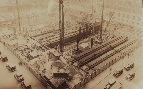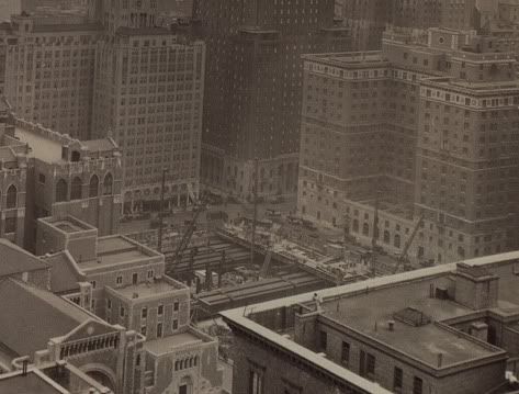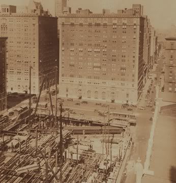 Waldorf-Astoria construction site in 1930, looking west. Train at Park Ave. & 50th St.