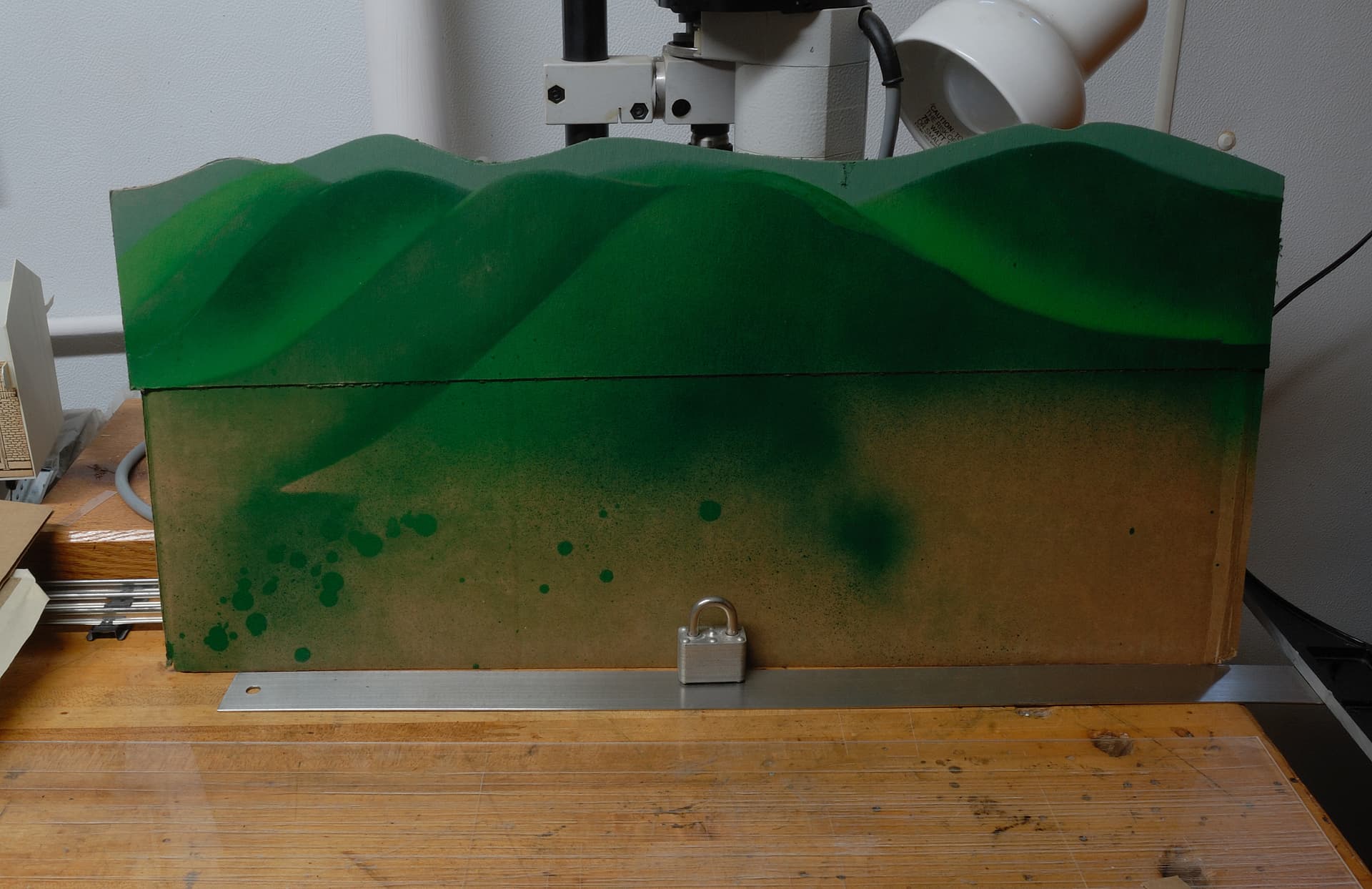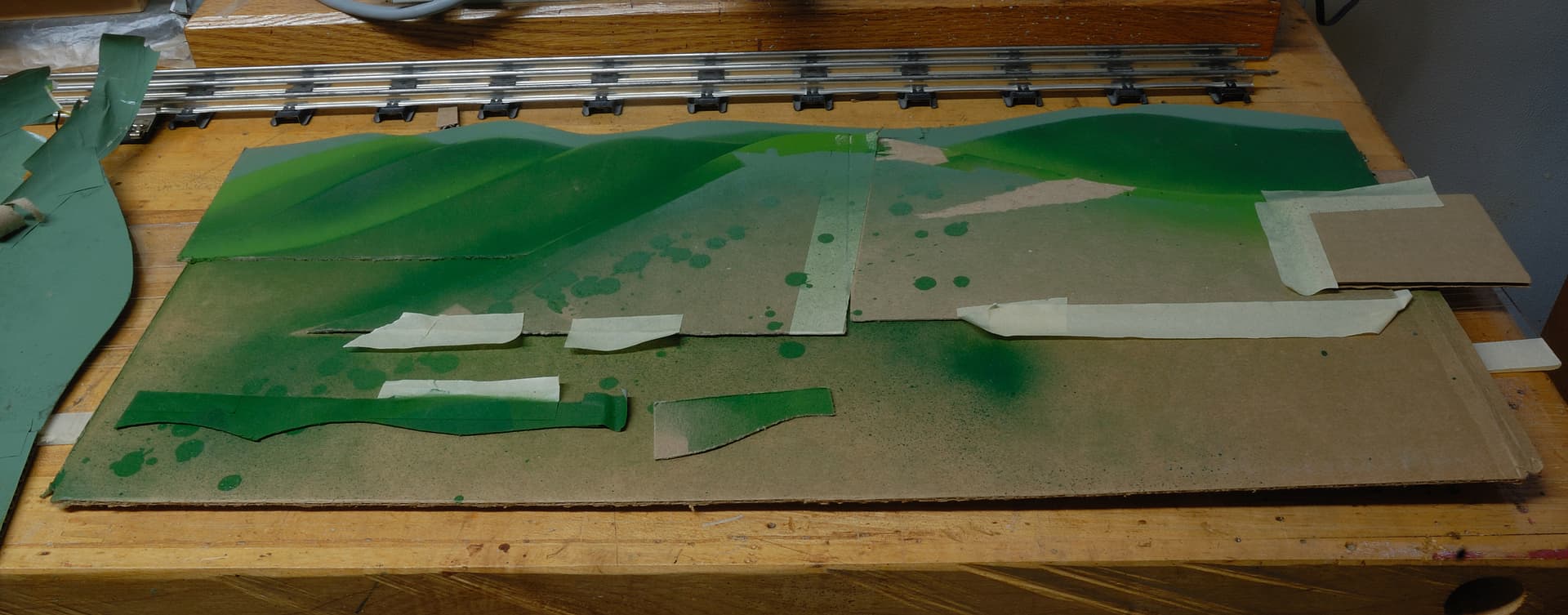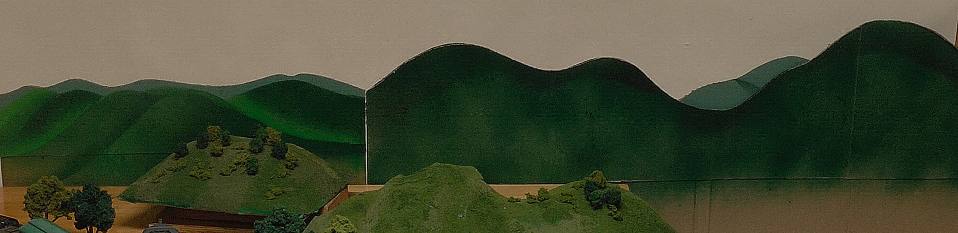 ..or you can cut out hill/mountain shapes from the cardboard spray paint the shapes and fit them in one behind the other to give a sense of hills and distance such as the cutouts to the right of the picture.