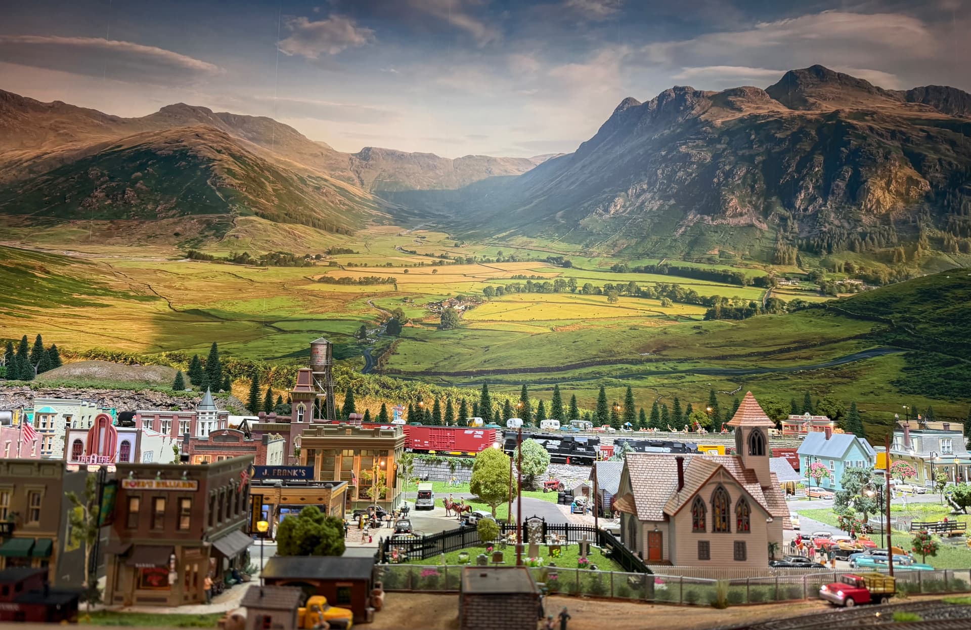 I would guess there’s a couple thousand model railroads that have used the Walthers “Instant Horizons” backdrops! They’ve been around since at least the 1970s, maybe even earlier? I can’t right now recall the artist’s name, but it seems to me he did a lot of other stuff too, like a lot of box art for model car kits from the 1960s-70s…maybe even designed some like the old “Red Baron” helmet hot rod I think.