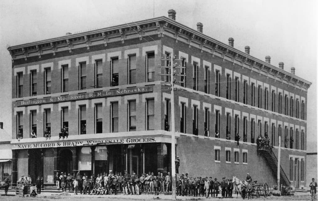 This old building in Omaha is called the Burlington Headquarters Building. The Burlington and Missouri Railroad (B&M) was eventually acquired by the CB&Q. It was built in 1879 and still stands today.