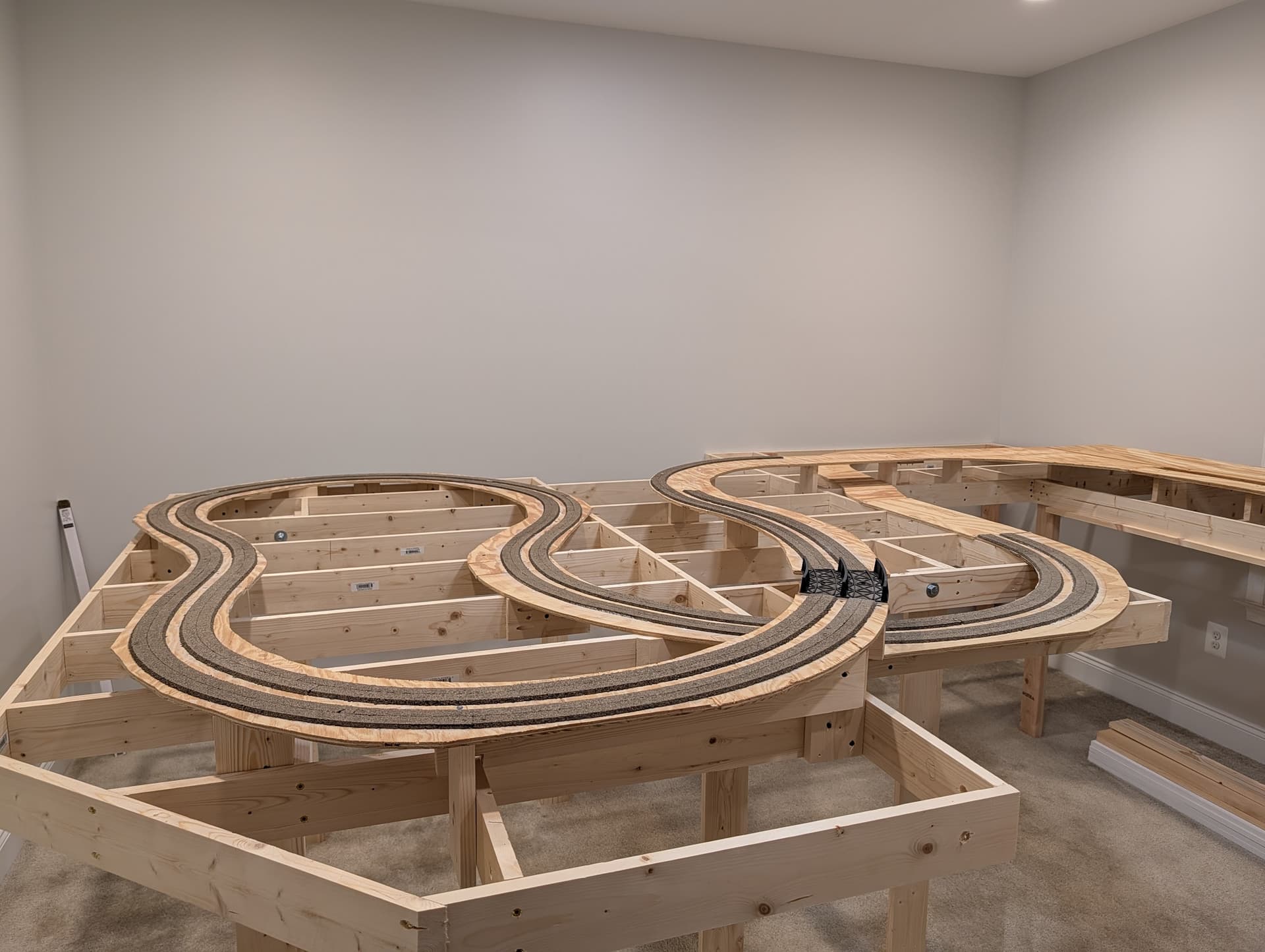Now I am worried about my one set of curves, I’m not quite ready to put down any track. I intentionally shortened up my straights there to make room for a 3rd line that was originally going to be a reverse loop, but my condensing of the plan is going to make that extremely difficult.