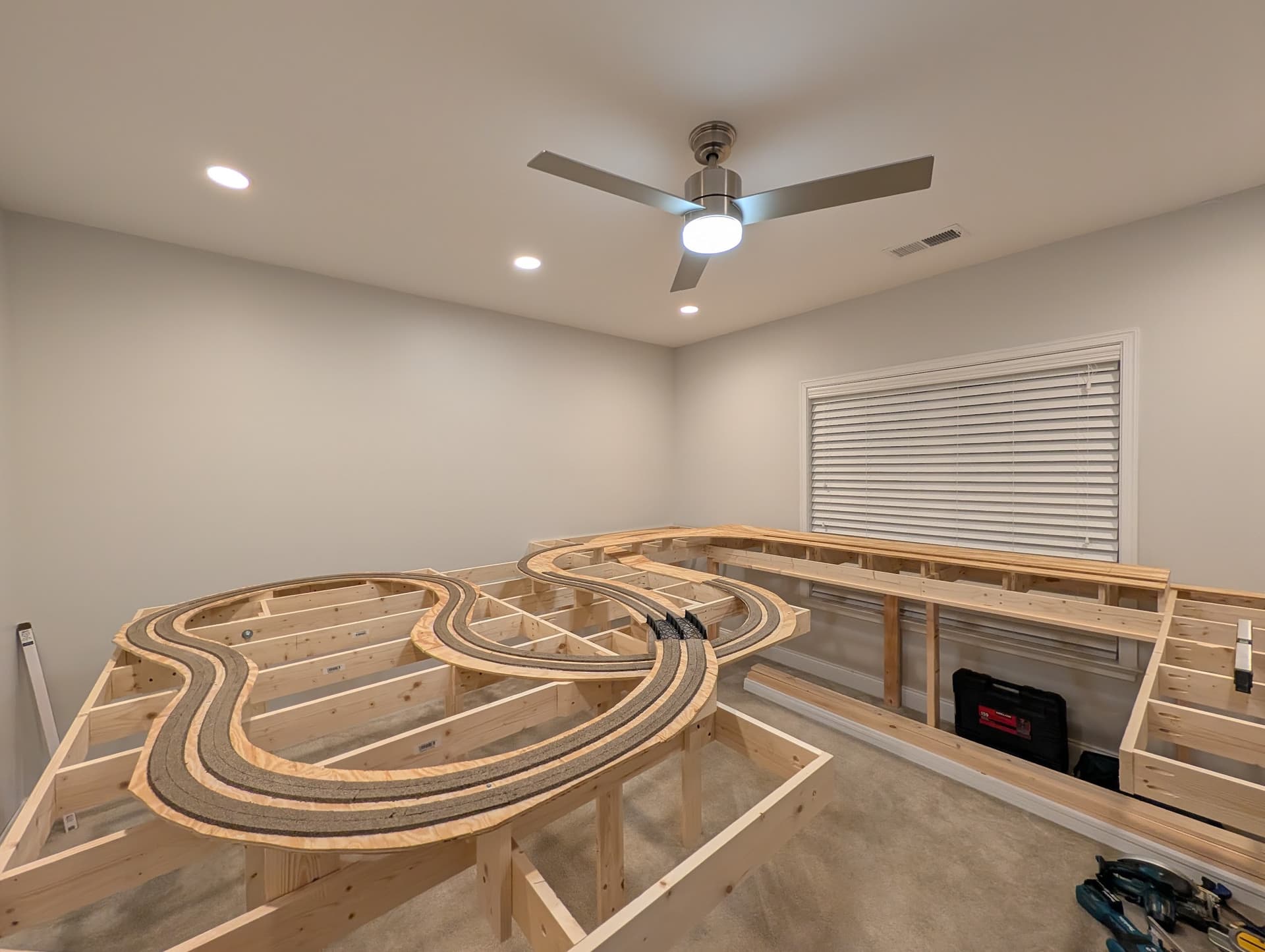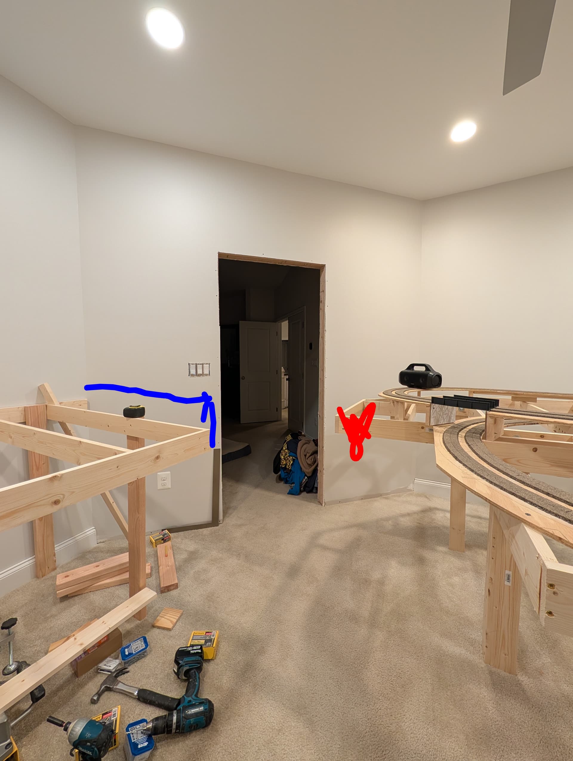 Original plan was to not have any walking space around the layout, but ultimately, I like this better as it gives more scene options. I did my best to keep one line at a min of 24". I keep saying, I should have went N scale… I’m not an expert in design by any stretch of the imagination, but I didn’t like what I was coming up with in ANYRail when trying for 26" min around the room.