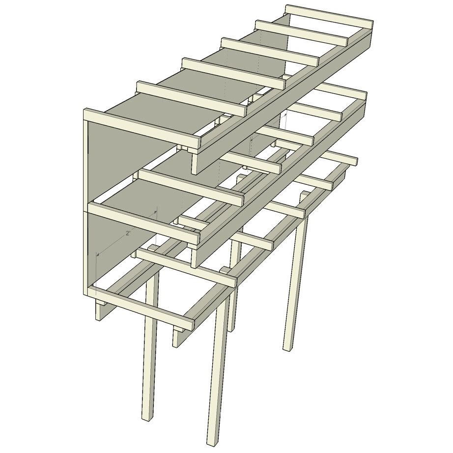 Look at the construction as a double deck with a shadowbox look, but without the sides. I’m trying to come up with a construction method where I can support the upper level without any supports that intrude into the lower deck.