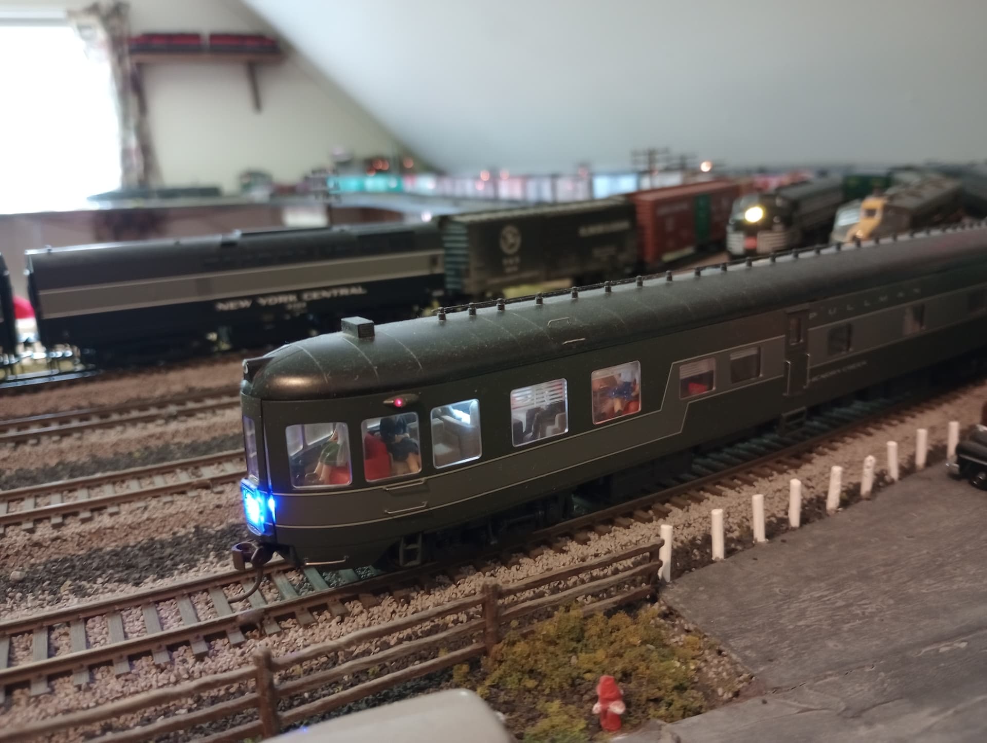 My âbrainlessâ MTH ProtoSounds 2, 20th Century Limited Dreyfuss Hudson and one of the 3 Williams heavyweight cars (baggage, coach & observation) in 2 tone gray that I run with her. I say âbrainlessâ because at the time this loco was cataloged in the mid 90âs nobody was aware of the damage a certain type of power supply would cause to the QSI circuit boards. So I ended up removing them and sheâs hotwired to run on DC 3-rail.