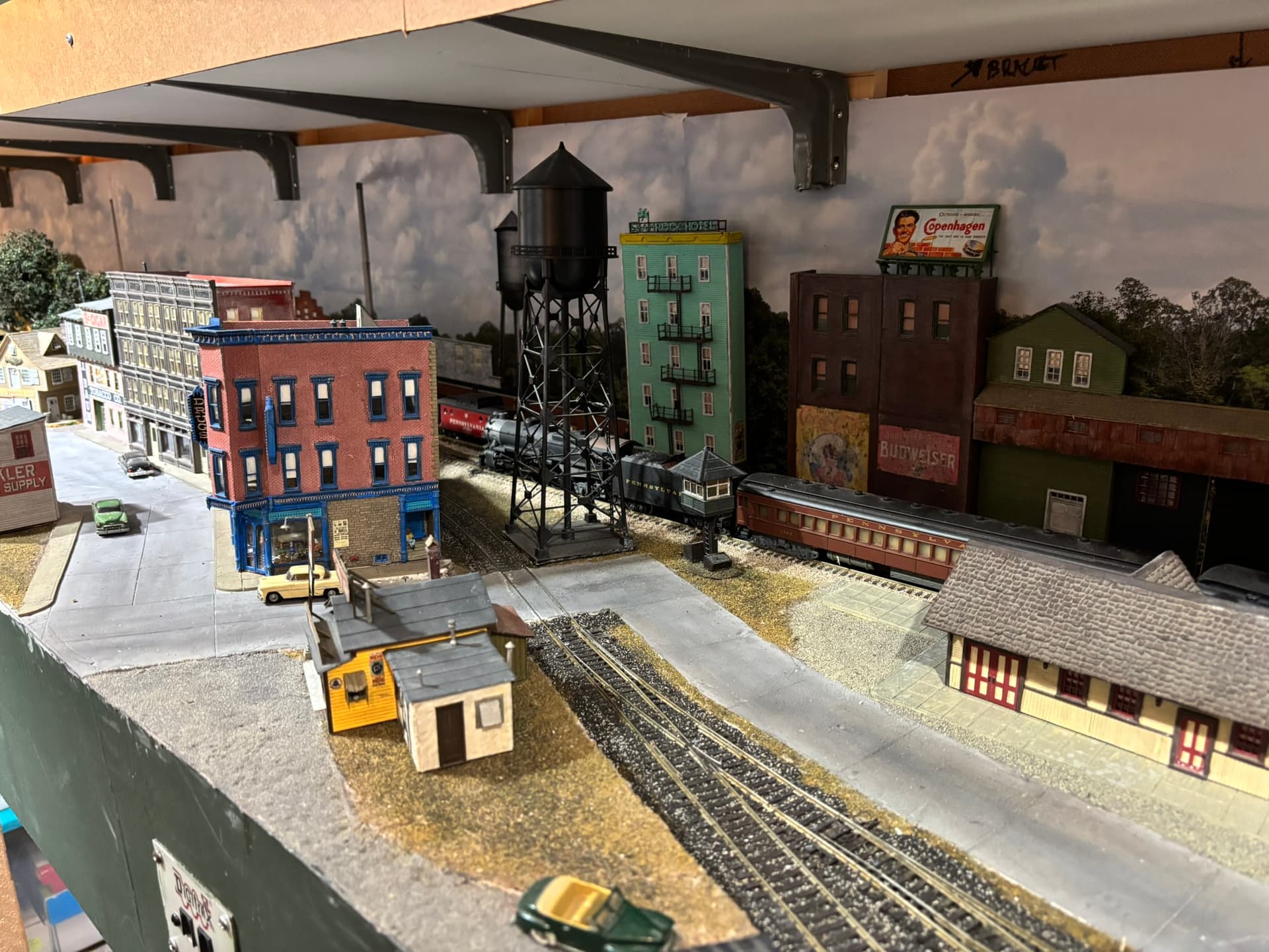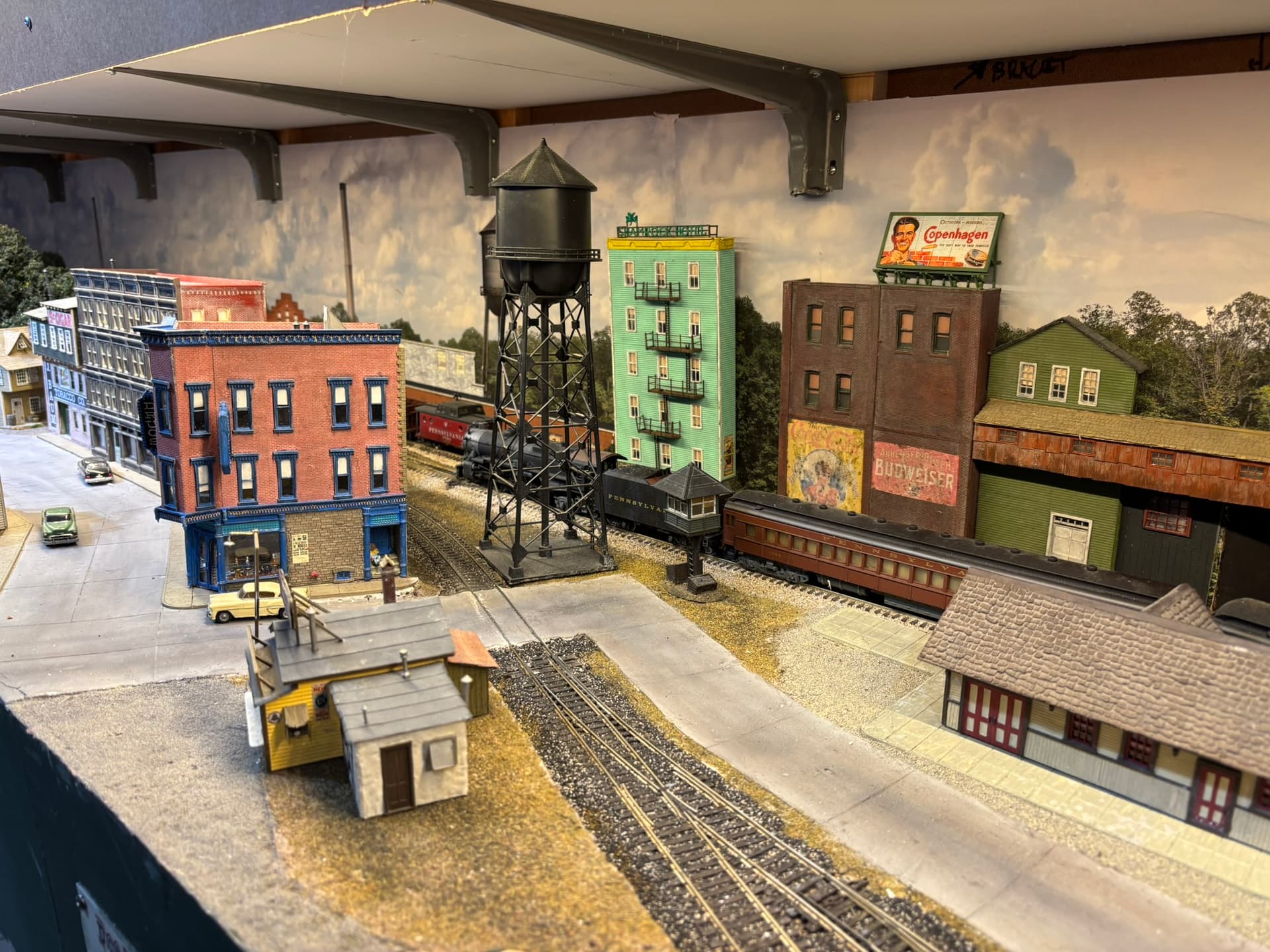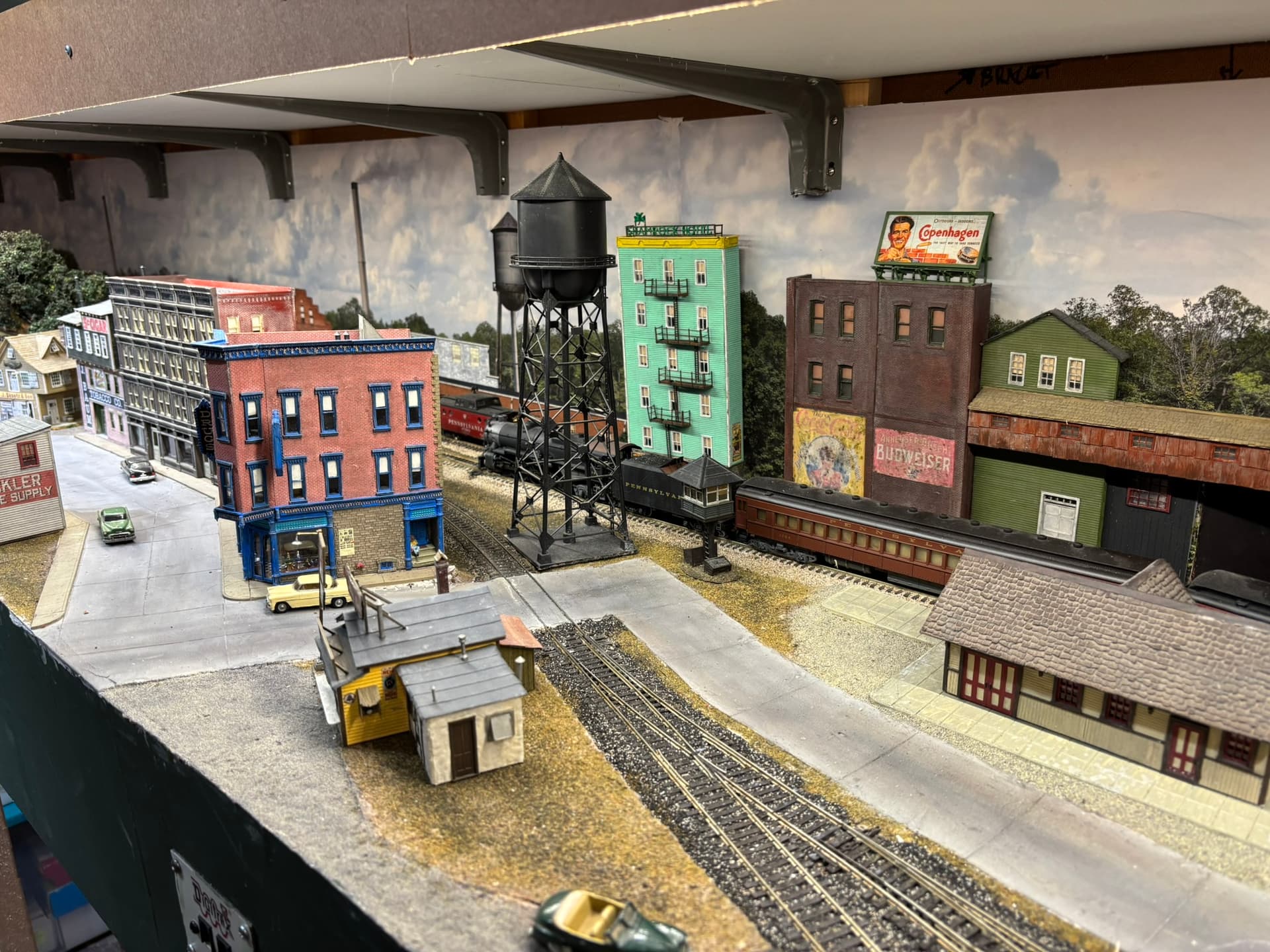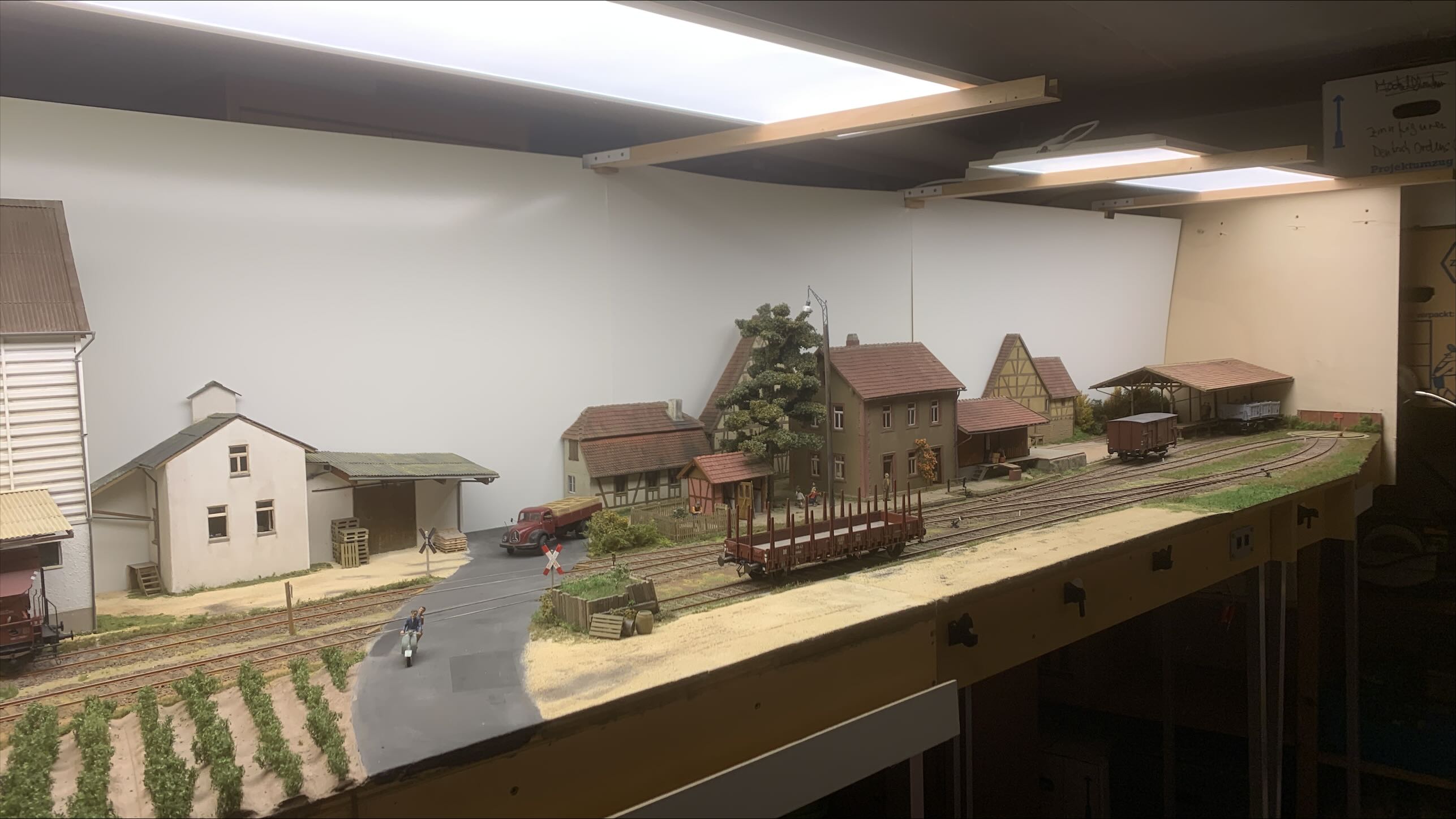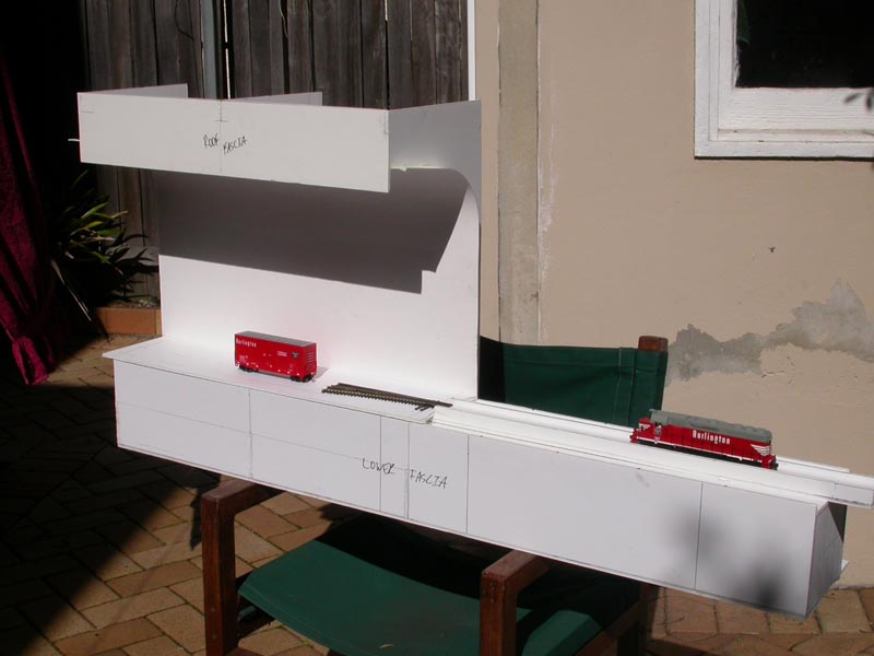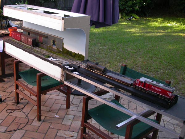 but i learned that taking layout photographs requires lighting from above to simulate sunlight and produce proper shadows instead of from the side. So lighting from above the layout might properly light the sides of objects at the rear of the layout, but not those near the front edge.