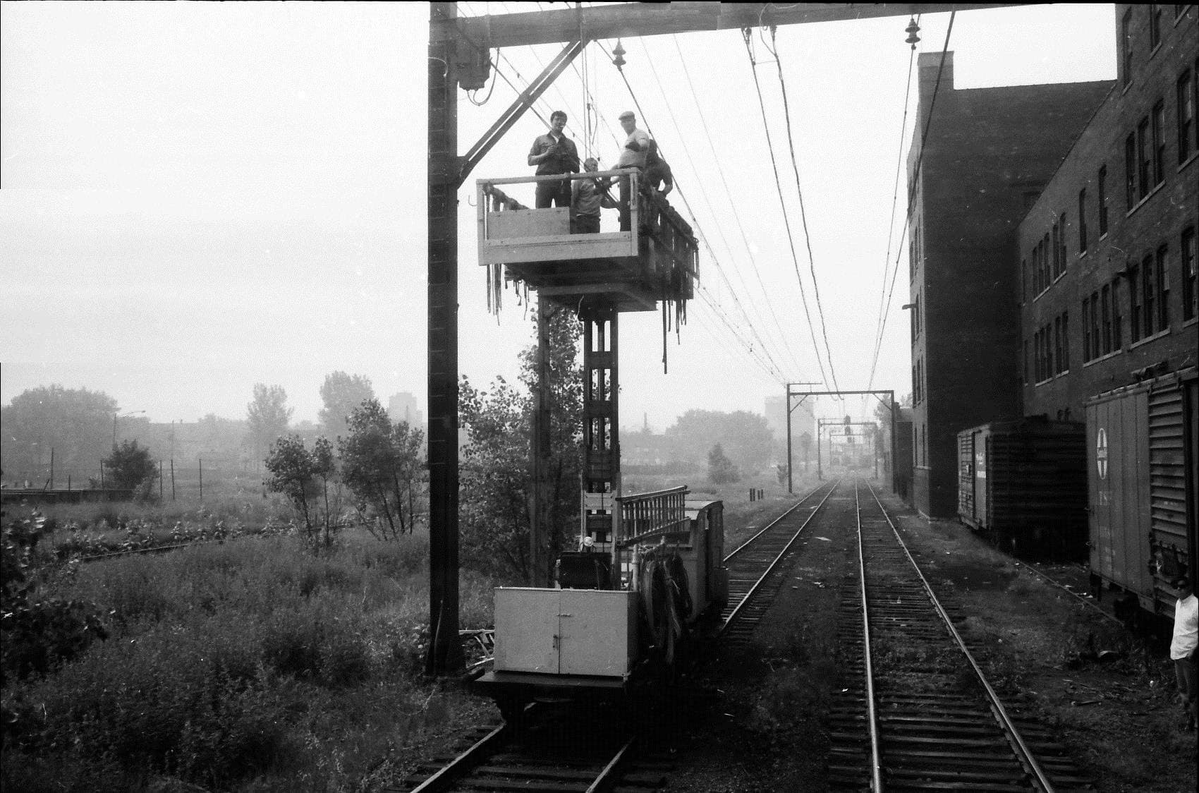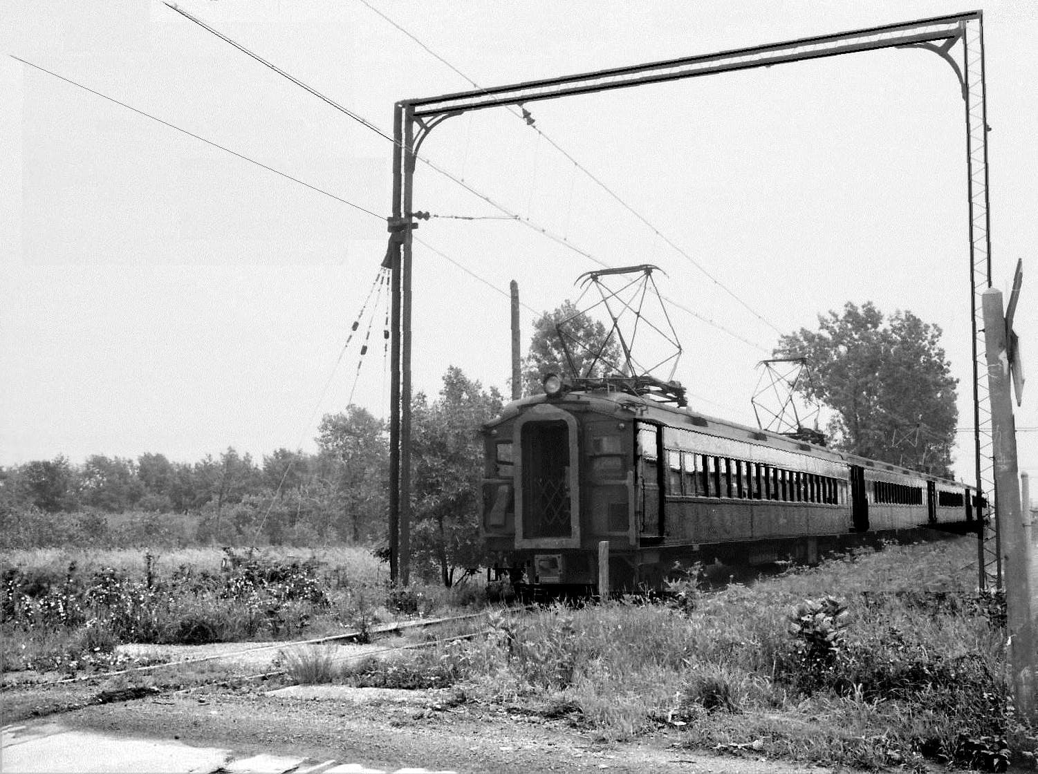 Most of the Blue Island line has steel bracket arm supports on single poles. The line was (and is) single track except for a passing siding at the West Pullman station. The photo with the wire train is probably on the South Chicago branch, which had several freight customers, and was double track its entire length.