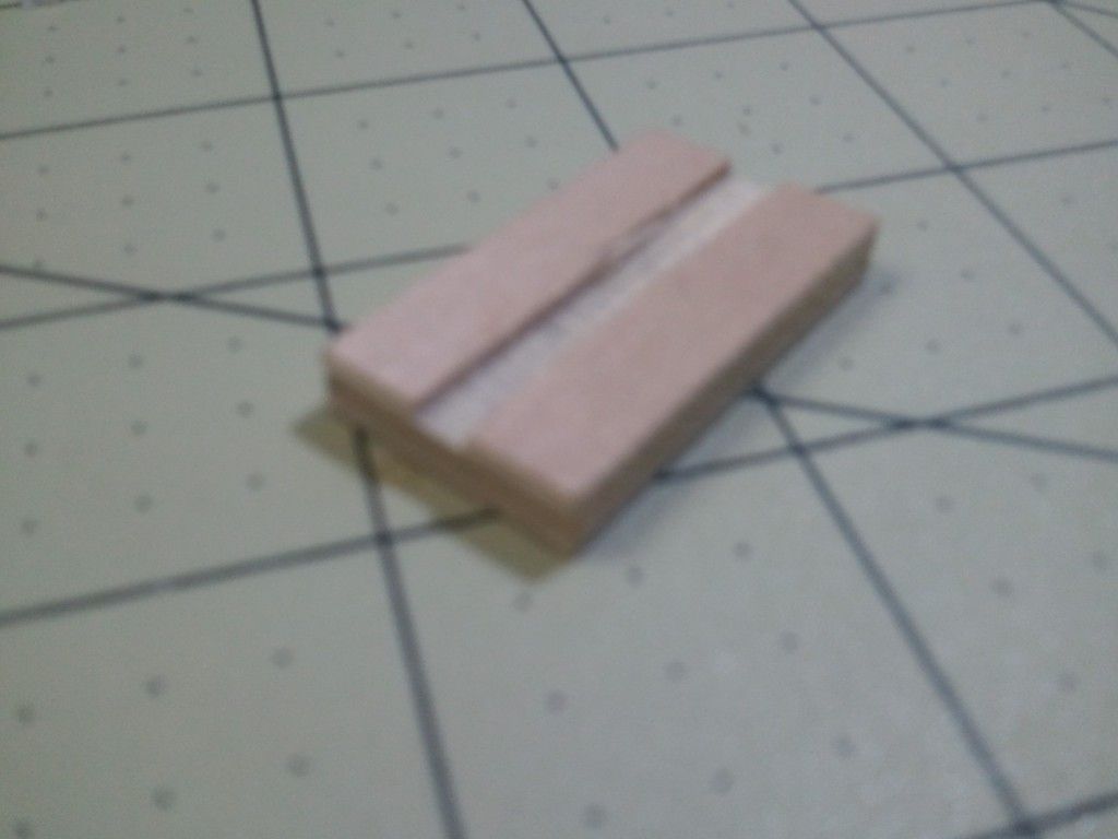 He took a handi-panel of 3/16" plywood(same thickness as the cork roadbed) and cut it into 3/4" strips. He then cut a 3/16" wide ‘kerf’ down the center about 1/16" deep. He then cut the strip into 1.5" blocks. We glue the switch stand block next to the throw bar with the same clear acrylic caulk and let it dry. We then attach the switch stand to the turnout and mark where the track nails need to go. We pre-drill the mounting holes and push the track nails home with a needle nose pliers. The result is a good solid mounting base!