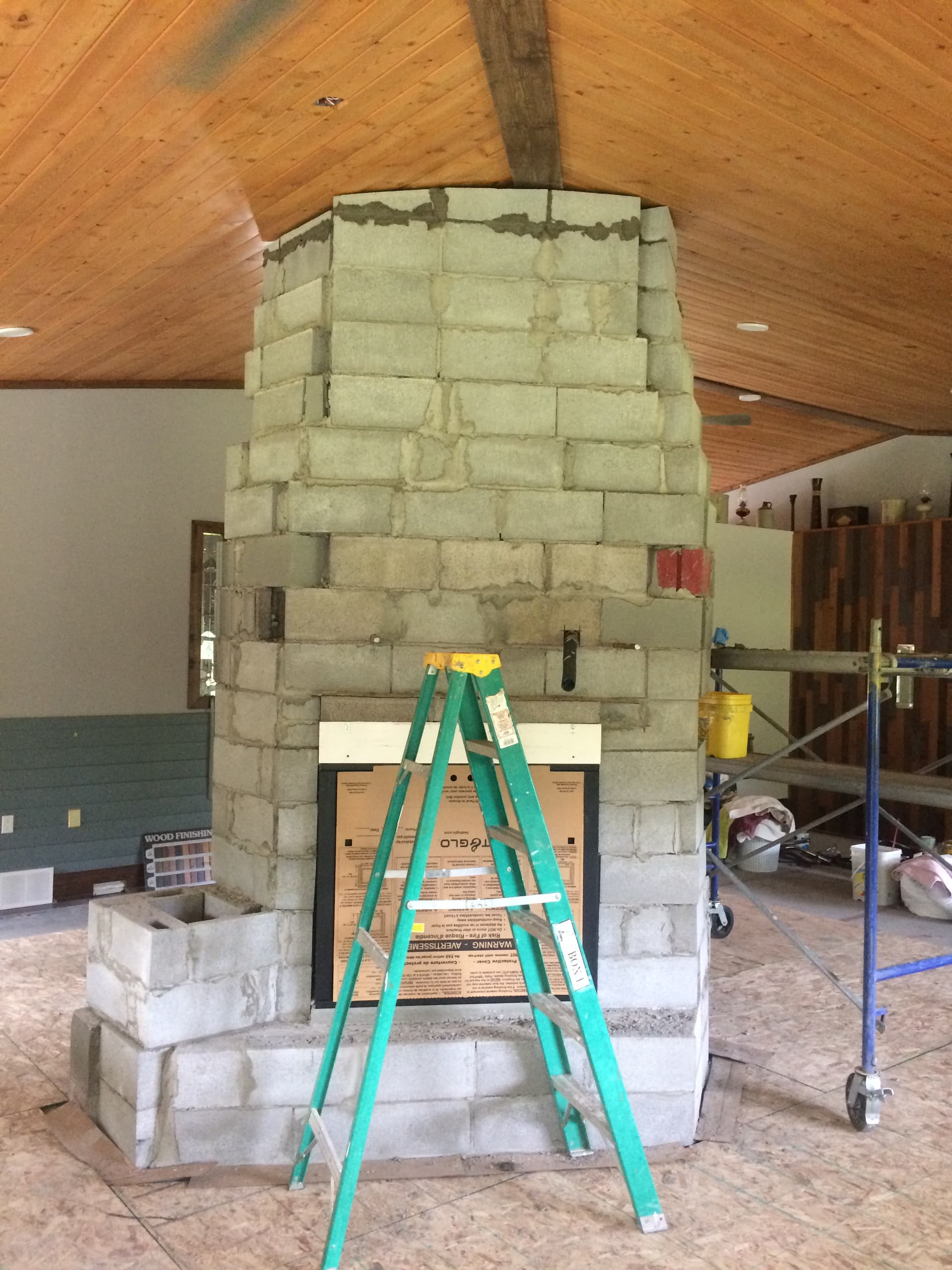 When we were planning our house that we built i really wanted a big old style fireplace. It took about 8 years for us to get the house to the point that i could start building it. By then my wife had declared that there was no way it was going to be wood. As she was tired of the mess and it goes well beyond dealing with the ash i have to agree on that. So we got a gas unit and i had a contractor friend who knew a bit about rock work and he got me started on things. After he had shown me how to first build a sub structure of cinderblocks around the gas insert.