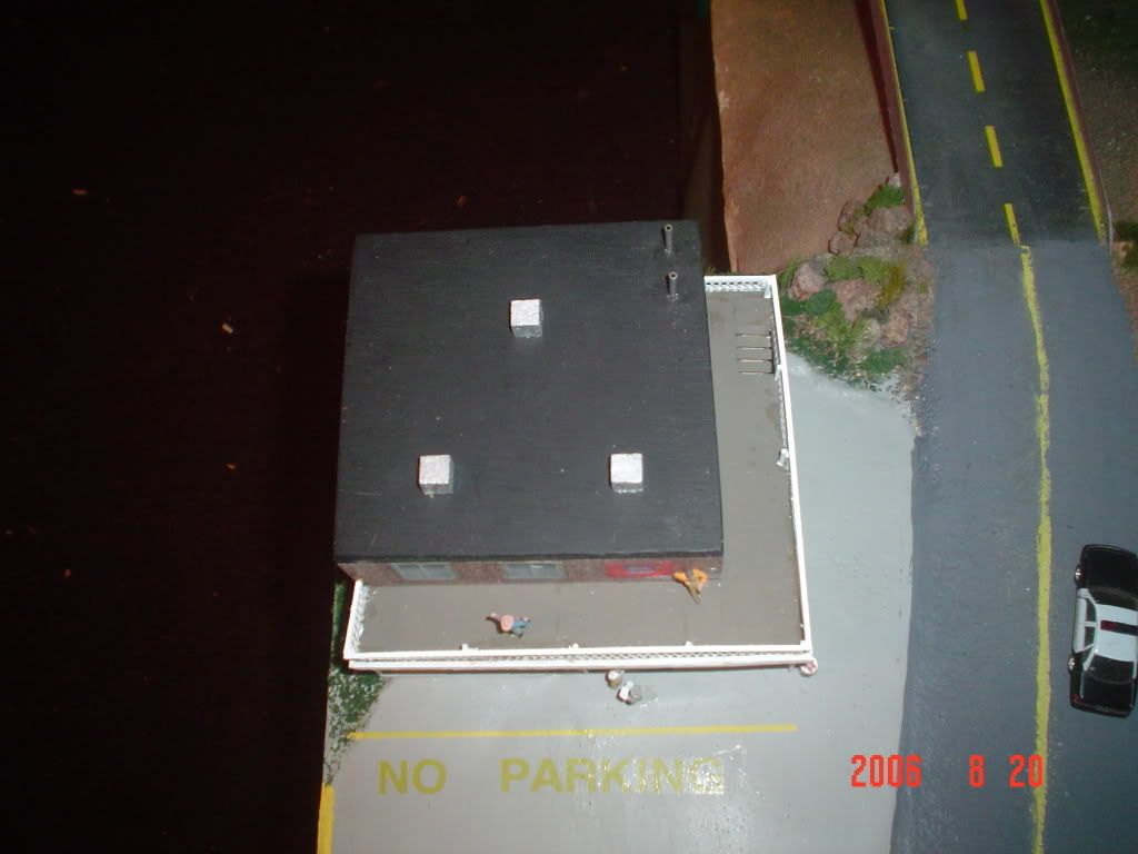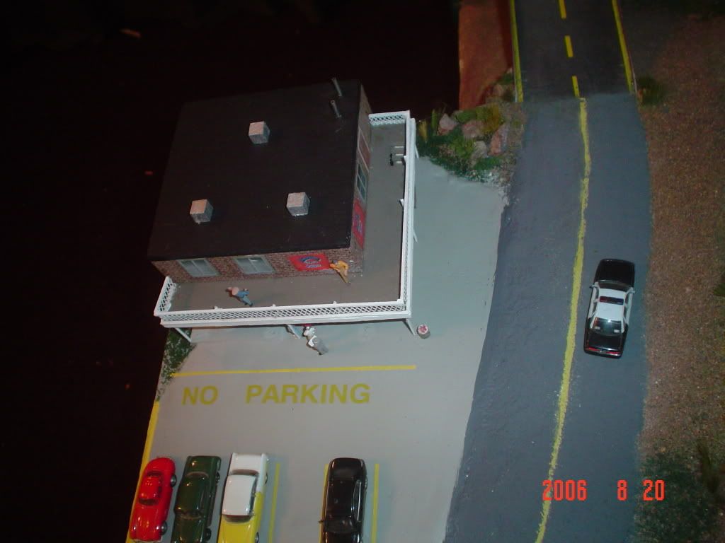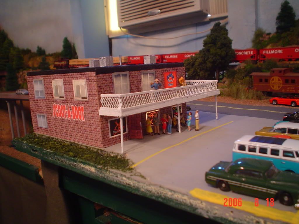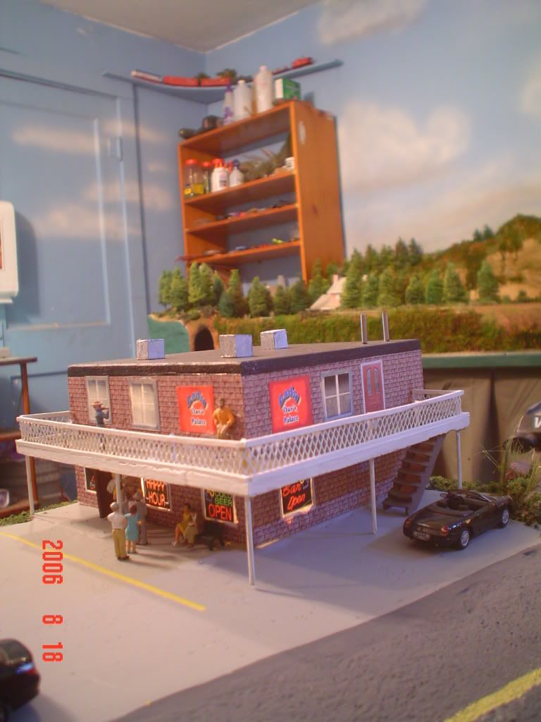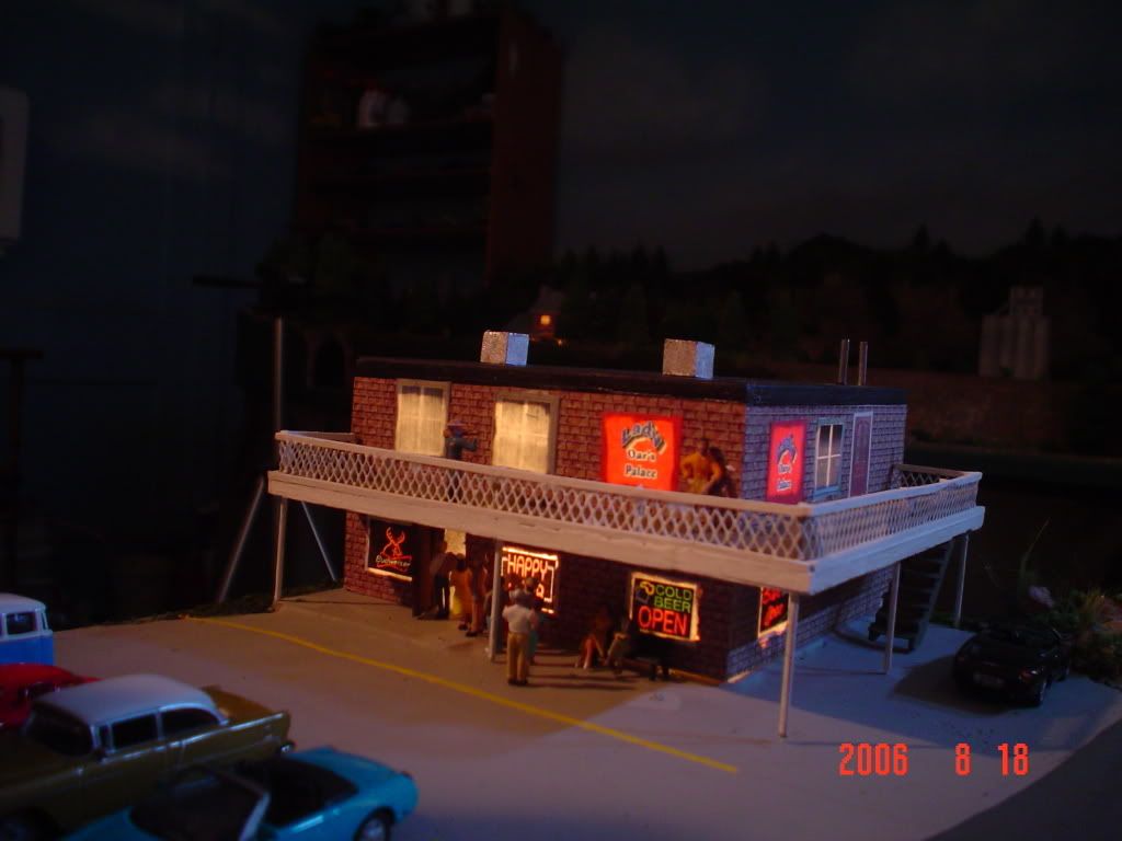 chatea…Thanks all for the positive responsises. as for the landing at the top of the stairs, as it is not noticable from this angle, there it a 8’ landing at the top of the stairs. and for the neon signs in the windows, I simply went on the internet and found some pics of neon bar signs and saved them in my computer, then imported them into my Print Shop to size them to the right size and glued them over the hole I cut out in the structure. By the way the structure is made from 1/4’’ plywood so they are cheap to build. Hope this info will help. Thanks again to everyone, I appreciate the input. Mike
