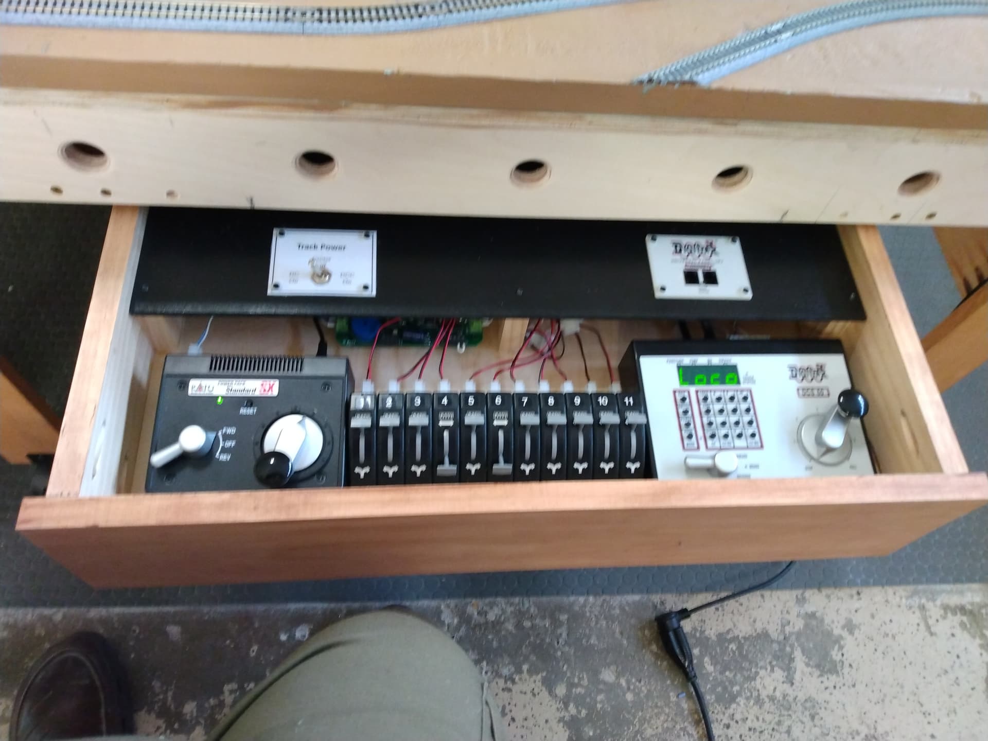 I designed a simple double track loop layout that consists of four 2’ by 4’ sections that fit together with clamps and aligning pins. There are also three spurs for industries and two short passing sidings in case I want to do some freight switching. Since I already have seven Kato passenger trains, I decided to go with Kato Unitrack. At the track joints between the sections, I remove the wings of the joiners to make it easier to connect the tracks. I have a drawer under one section with a Kato DC power supply and turnout controls and I am using an old Digitrax Zephyr DCS50 for DCC. There is a toggle switch that allows me to go between DC and DCC. And I have a Digitrax UR93 transceiver for a remote DT602D throttle.