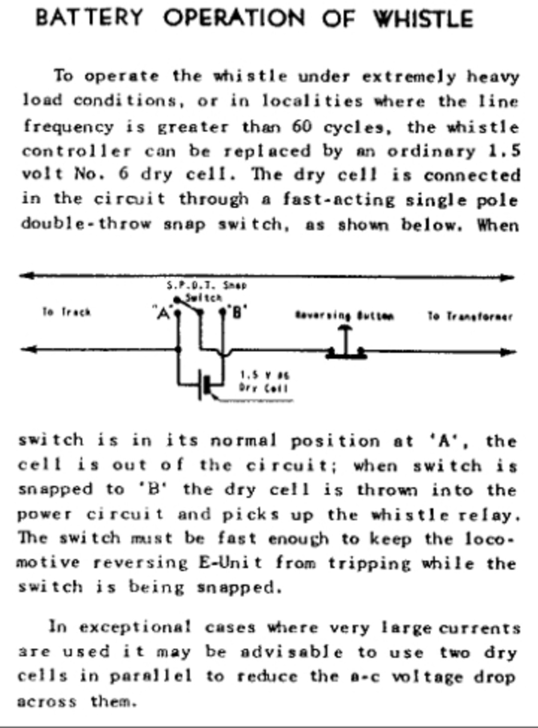 No, I’m not referring to the Lionel pushbuttons. Those definitely will not work (it probably could be rigged up to work, but is likely not worth the trouble). The DPDT switch could work, but it needs to NOT have a center off position. Switches like these are optimal: WMYCONGCONG 15 PCS SPDT Momentary Push Button Switch 3 Pin AC 2A 250V/ 5A 120V NO/NC: Amazon.com: Industrial & Scientific, but if you don’t have them then you’ll have to buy them. The switch itself, in the diagram, is the white line. Using the 1033, you would want to hook up A to the primary transformer and B to the battery. The transformer has to be in phase with your primary transformer. As for the battery itself, a D cell works quite well but really any 1.5v battery will work. Oh, and the battery may not be quite enough to activate some whistles (especially if they haven’t been serviced in a while), so you could quite easily use two batteries in series instead of one battery.