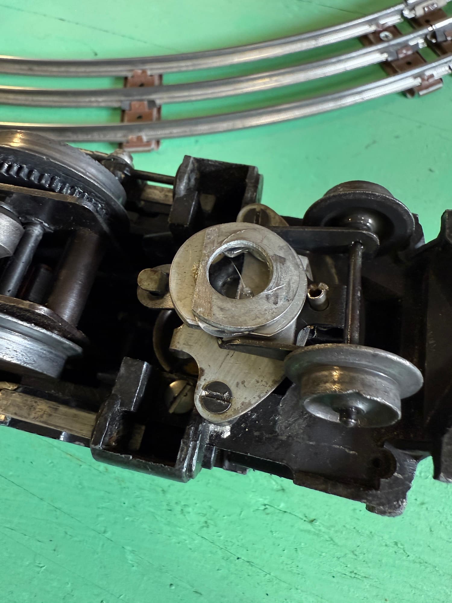 I hot glued two washer together then used a double backed foam tape to fix the washers to the truck. There is at least 1/8" clearance to the center rail. Worked so well I thought I fixed the wrong car The tissue still stuffed in the truck was the give away. The video of the train running over all the switches was too big to up load. On to the next engine repair. Who would you recommend for parts? I have one or more broken trucks etc., in need of replacement vs repair.