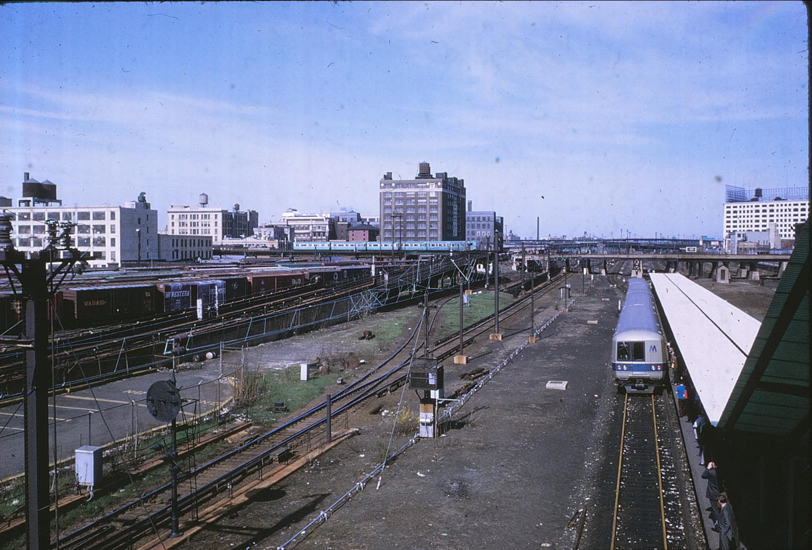 Jay interlocking, southwest of Jamaica Station,building in background, 1970 or1971. Platform used only by LIRR people. “B” yard in center. Tracks at extreme right to Brooklyn, .Tracks at left to Penn Station & LICity.