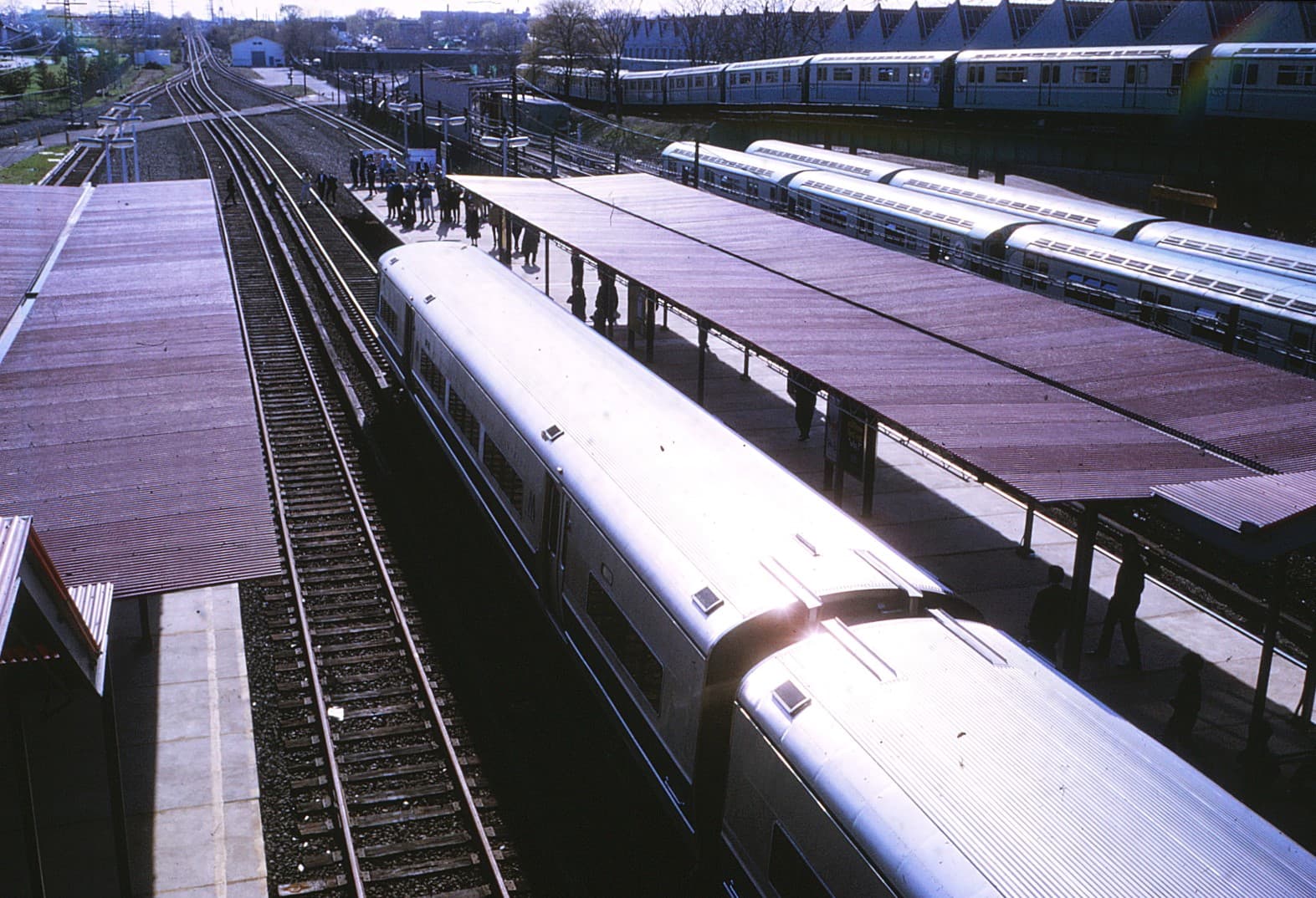 When I used to walk to school, there were no fences, though I see one in the picture of the station. apparently intended to discourage people from crossing from one side to the other. One time on a tour of Sunnyside yard, my father tried to teach me the right way to cross a 3rd rail: by stepping over it, not stepping on the wooden board that covered it. That seemed dangerous, as my ankles would be very close to the rail. But stepping on the board would inevitably result in its collapse when you discovered a rotten board. At least my schoolmate was not killed, but had a nasty, permanent scar on his forearm. Ah the good old days!