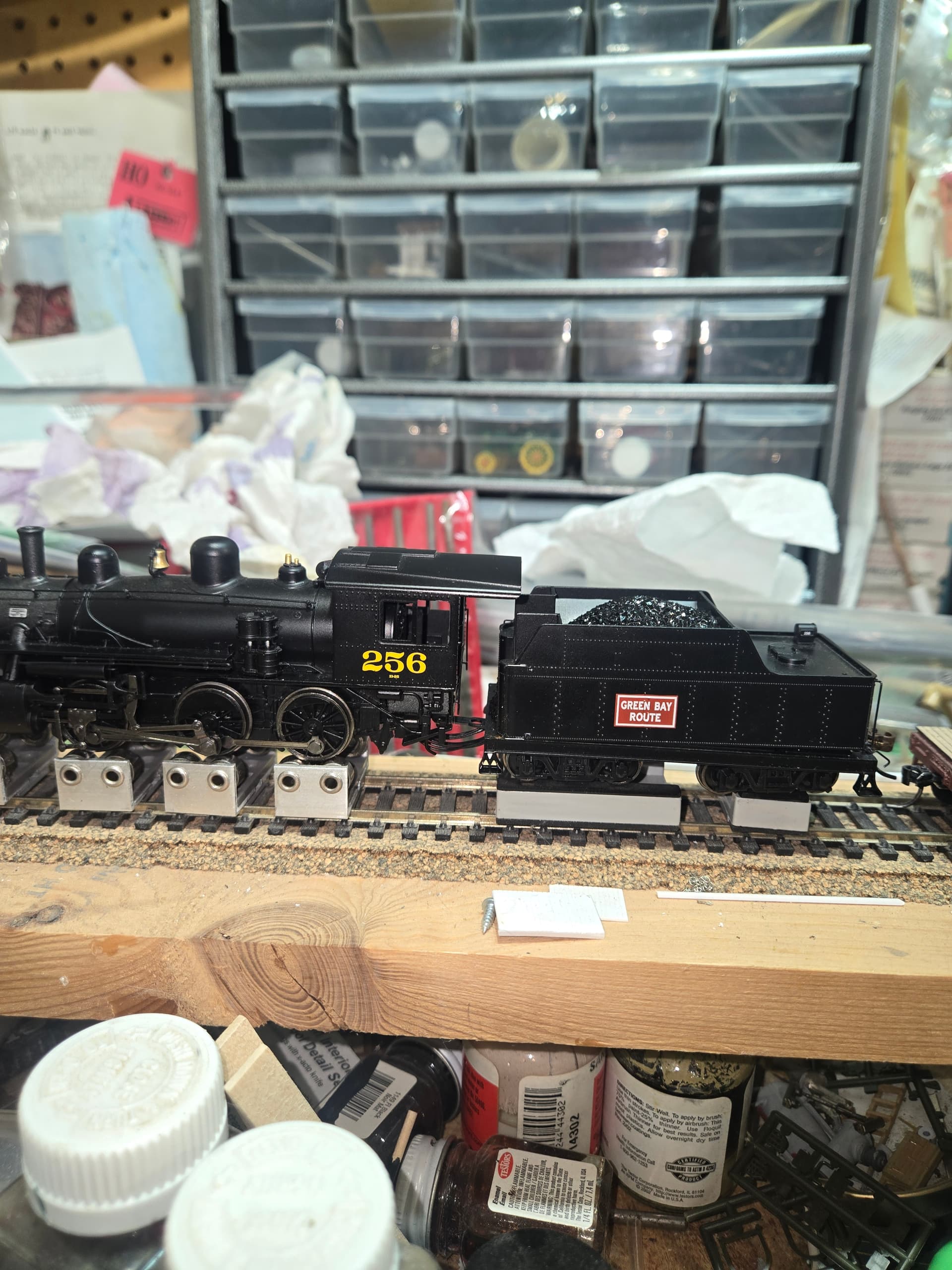 The tender is one intended for the Bachmann tin Wheeler that may still be in the Bachmann Parts store. I bought three or four of them while I was at it because those things have a way of going away and never coming back. All of my engines are being converted to oil burners, and the bunker on that one is a spare part from a spectrum Richmond 4-4-0 back in the days when Bachmann actually did stuff like that.